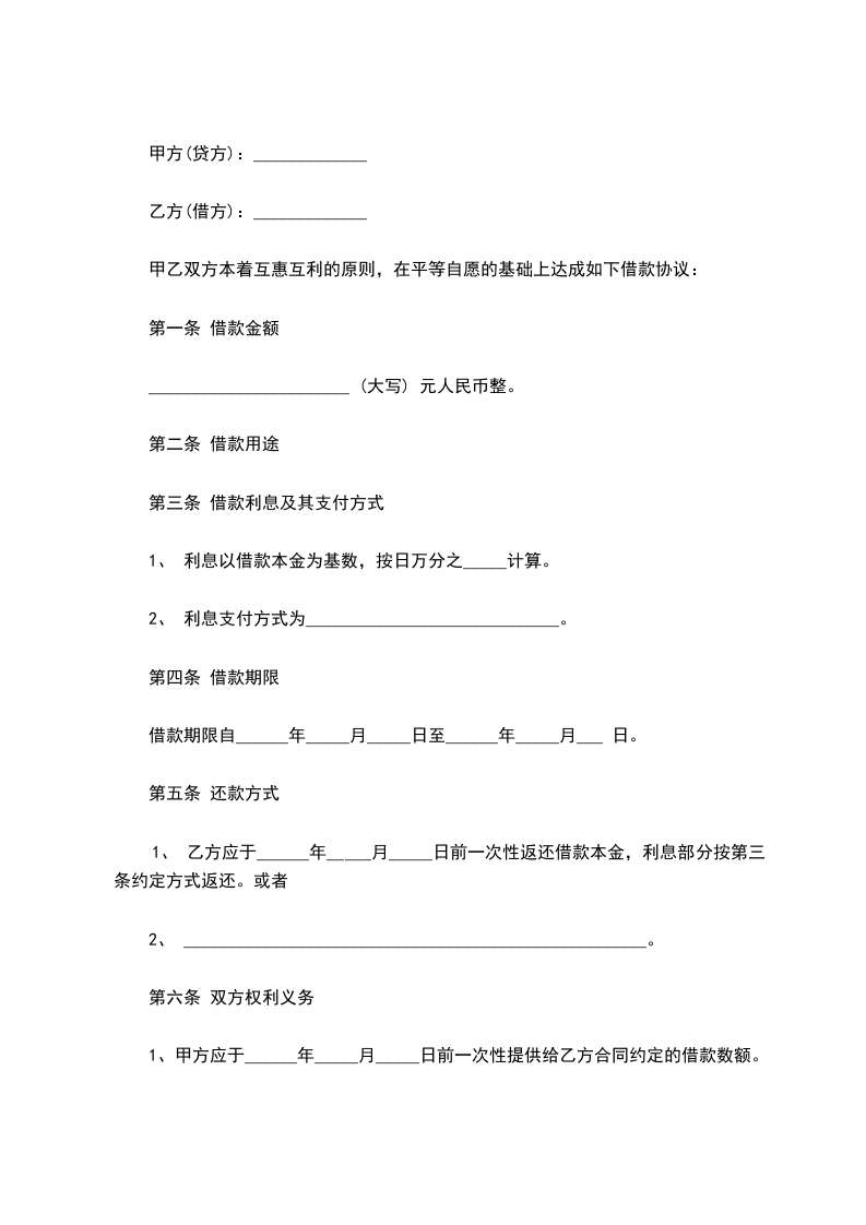 1、 甲方应于______年_____月_____日前一次性提供给乙方合同约定的借款数额。