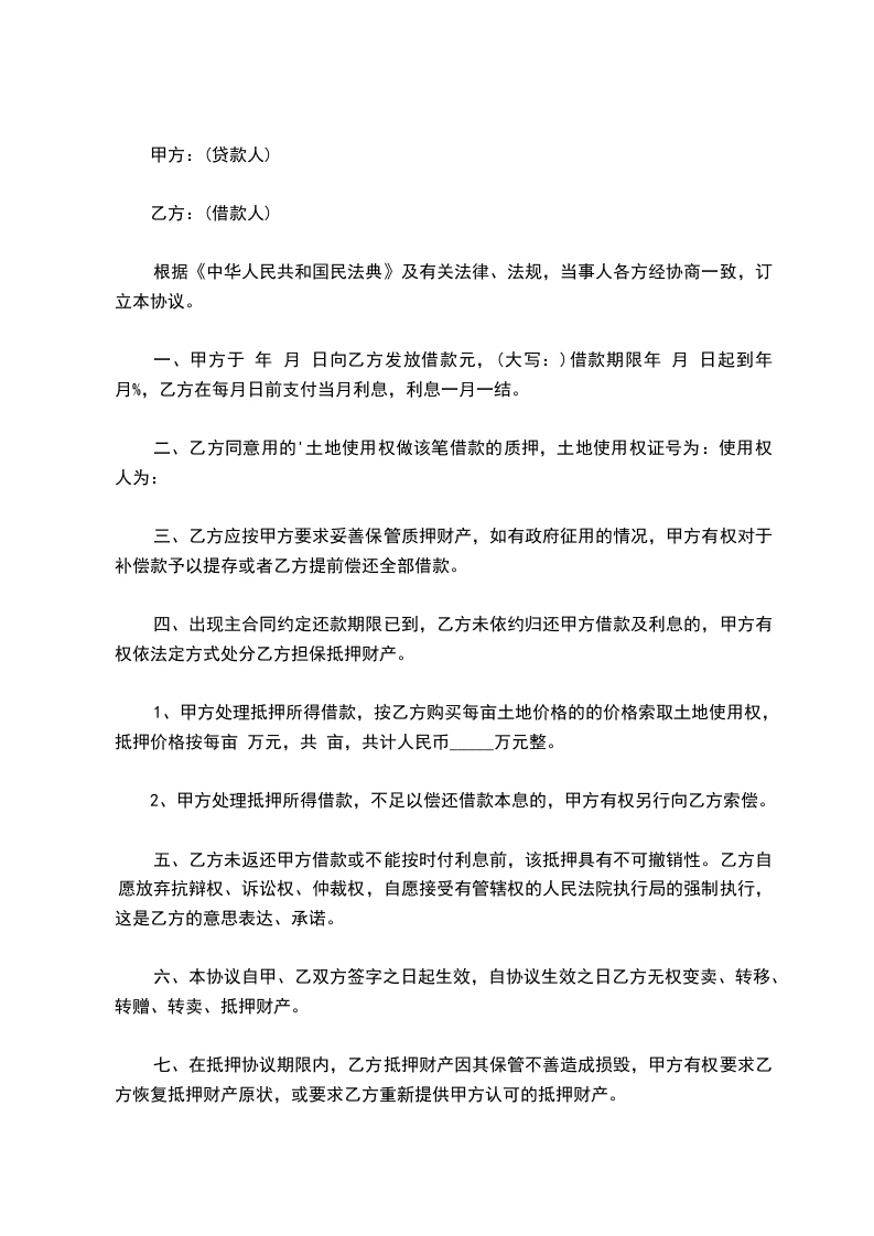 1、甲方处理抵押所得借款,按乙方购买每亩土地价格的的价格索取土地使用权,抵押价格按每亩 万元,共 亩,共计人民币_____万元整。