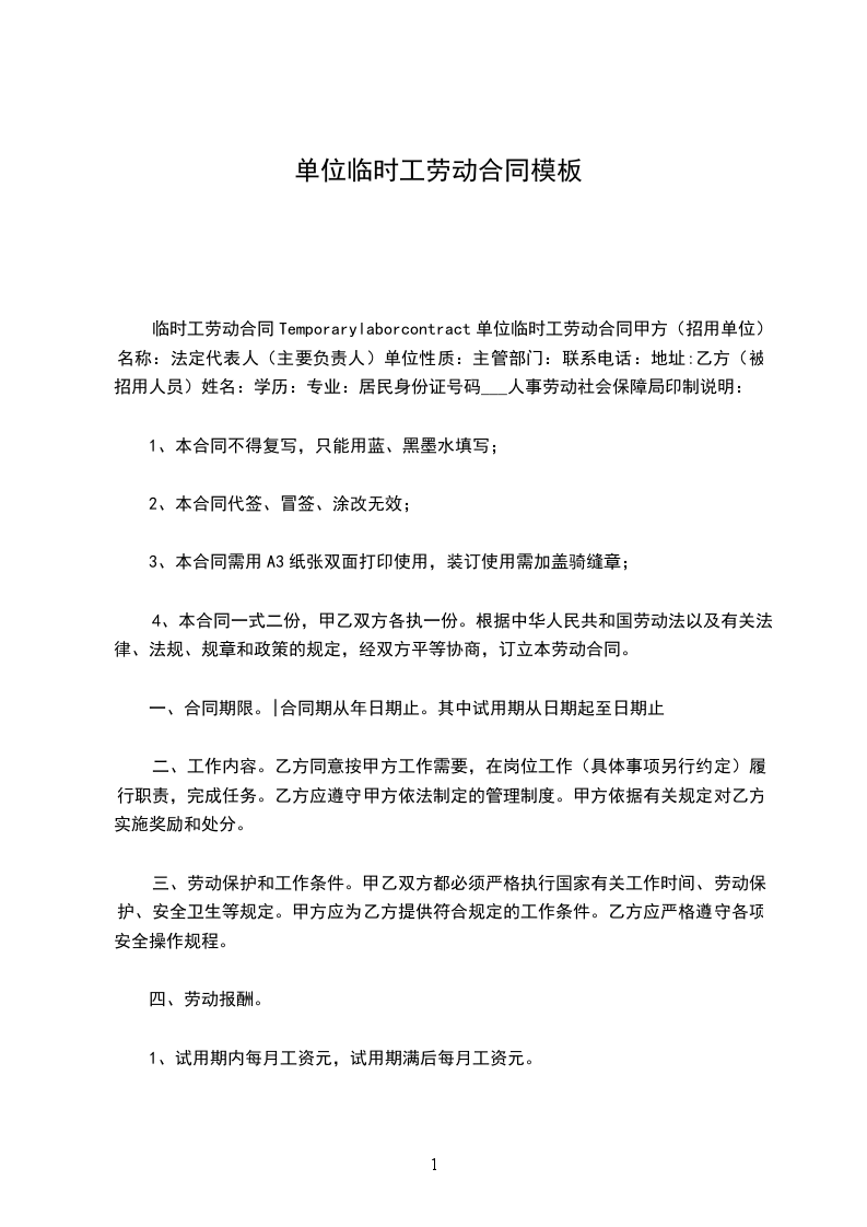 根据《_________》的规定,单位(以下简称甲方)因生产、工作需要招用_________同志(以下简称乙方)为临时工,经双方协商同意,签订本劳动合同。