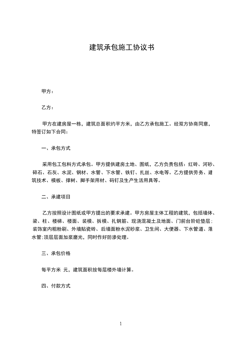 采用包工包料方式承包。甲方提供建房土地、图纸,乙方负责包括:红砖、河砂、碎石、石灰、水泥、钢材、水管、下水管、铁钉、扎丝、水电等。乙方提供劳务、建筑技术、模板、撑树、脚手架用材、码钉及生产生活用具等。