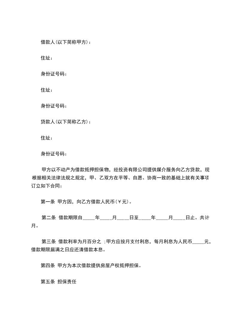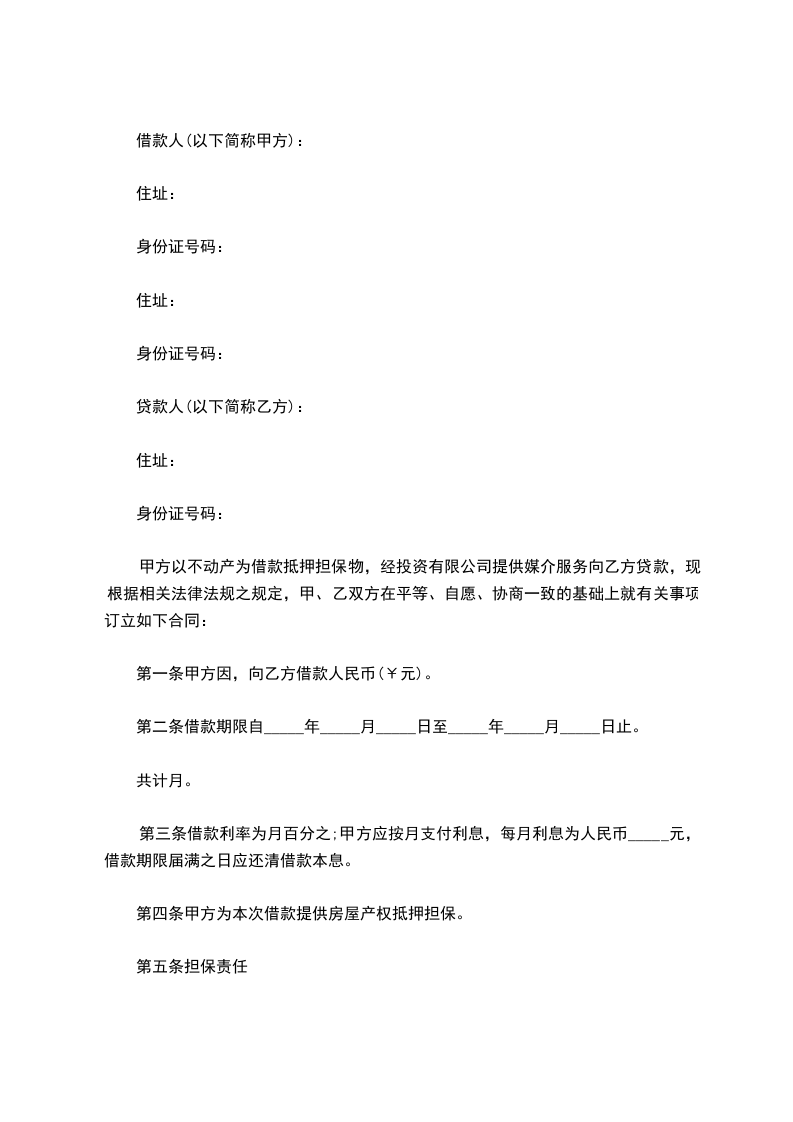 甲方以不动产为借款抵押担保物,经投资有限公司提供媒介服务向乙方贷款,现根据相关法律法规之规定,甲、乙双方在平等、自愿、协商一致的基础上就有关事项订立如下合同: