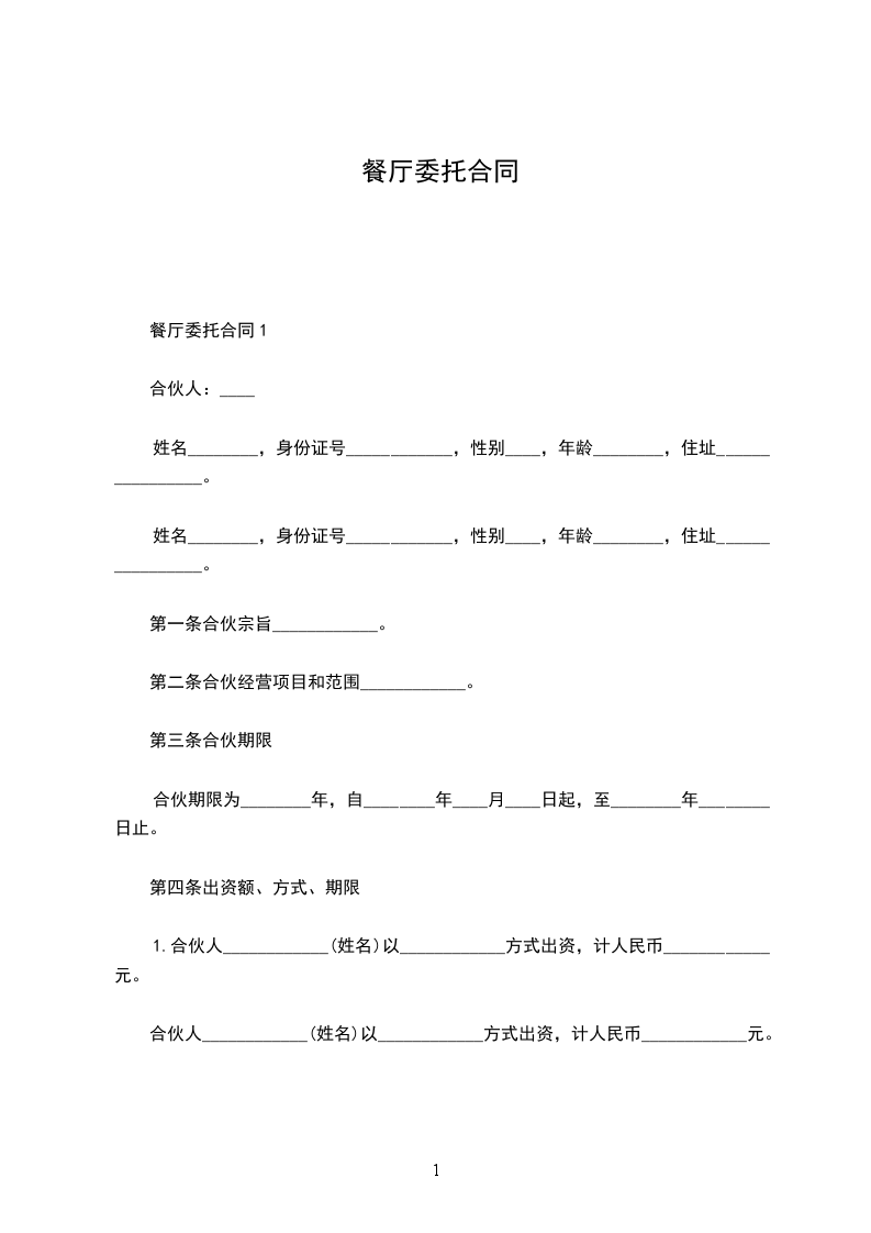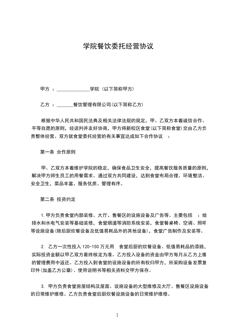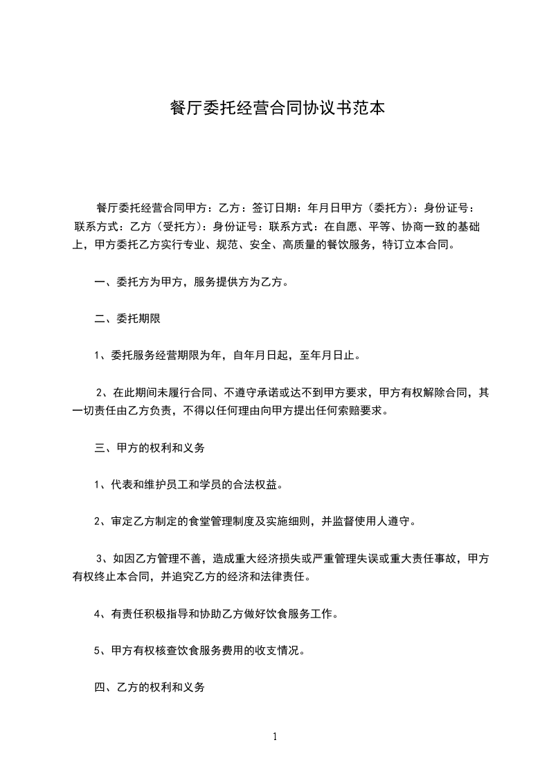 根据《民法典》及其他有关法律规定,甲乙双方就餐厅委托管理事宜经共同协商,订立以下条款共同遵守: