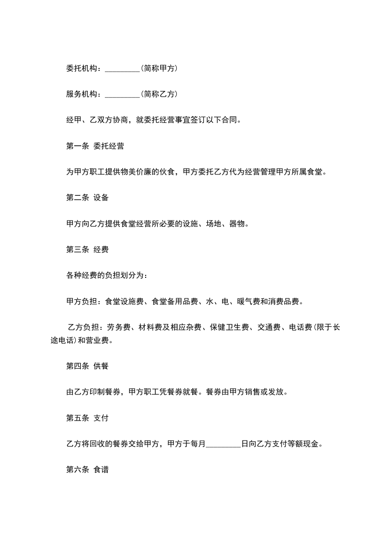 1、结算方法:甲方应及时结算,并以现金或现金支票付款。甲方按协商规定的管理费用每月结算一次餐费。