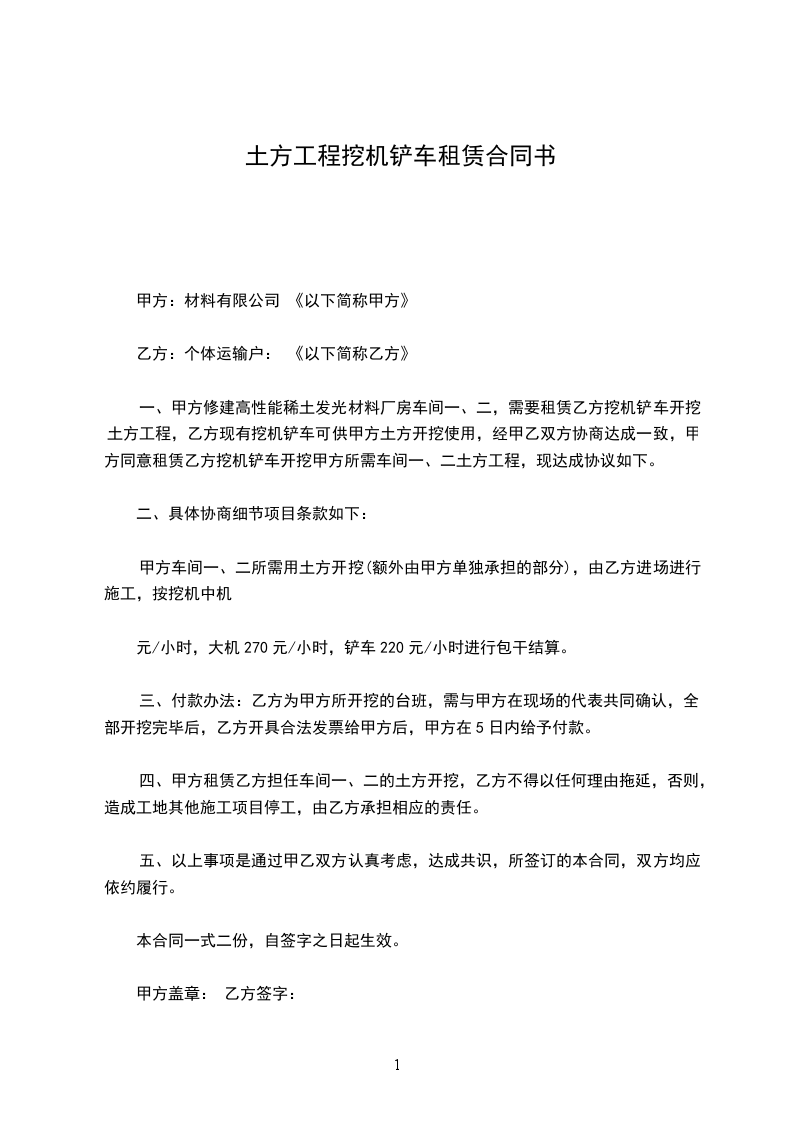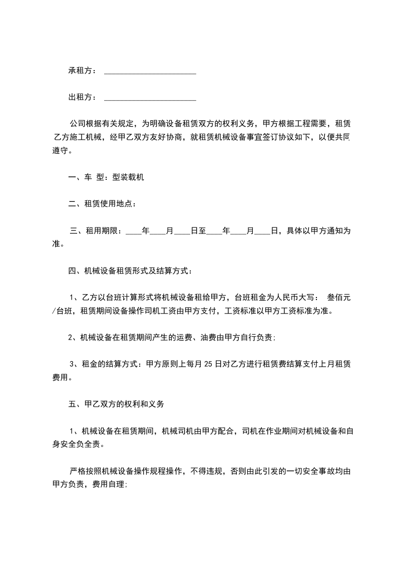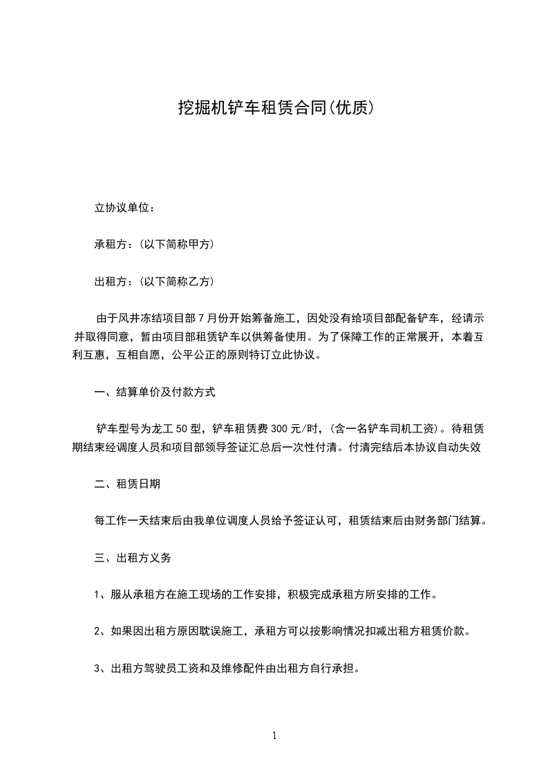 乙方有 台铲车租给甲方,经双方协商,按月租给甲方使用,租金为 元整。为保证正常施工,经甲、乙双方协商制定如下合同,望双方互相遵守,如有违约,甲方有权解除合同。