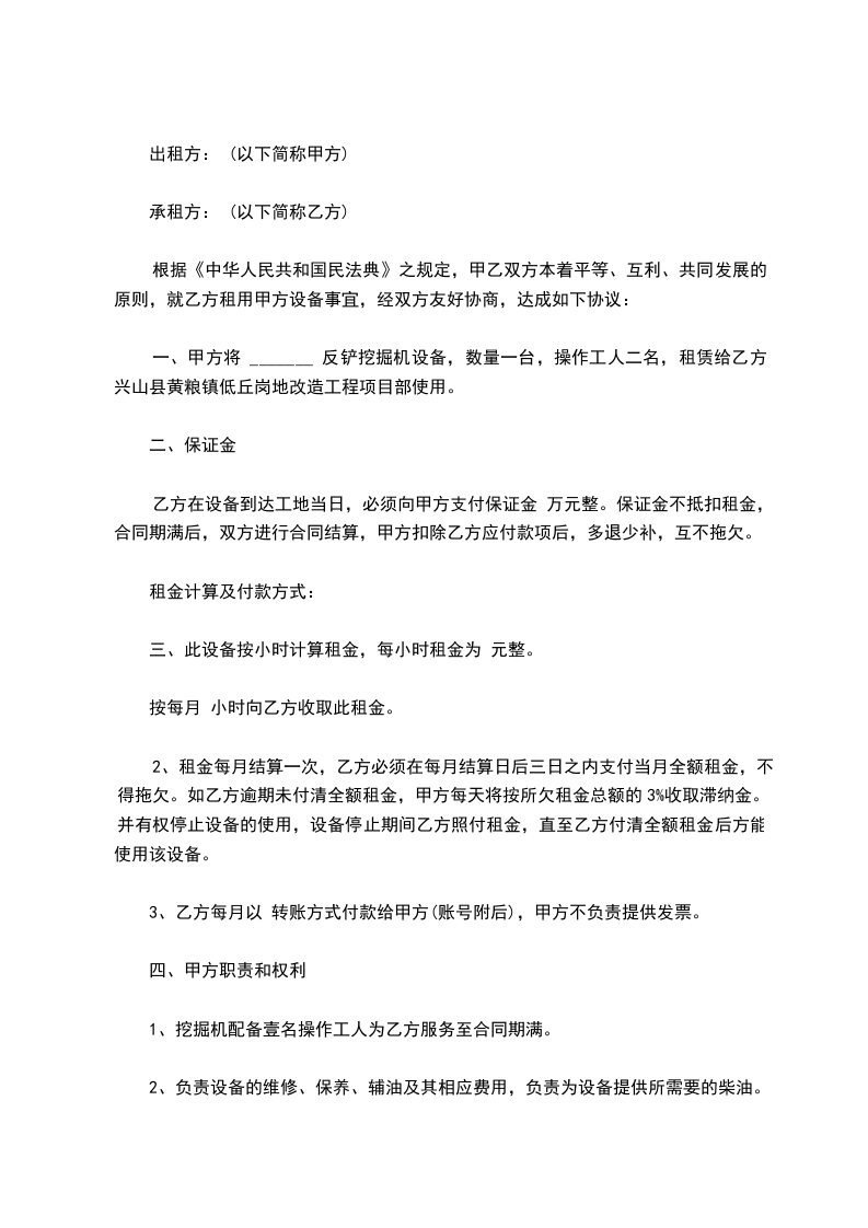 2、结算方式:设备租赁按包月计算,若挖掘机带炮锤则另行计算,按大合同结算。