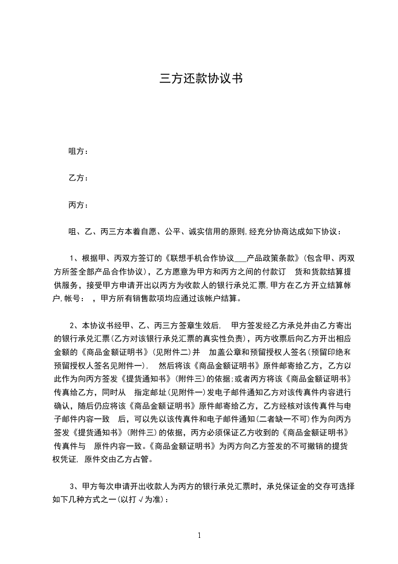 1、根据甲、丙双方签订的《联想手机合作协议___产品政策条款》(包含甲、丙双方所签全部产品合作协议),乙方愿意为甲方和丙方之间的付款订 货和货款结算提供服务,接受甲方申请开出以丙方为收款人的银行承兑汇票,甲方在乙方开立结算账户,帐号: ,甲方所有销售款项均应通过该账户结算。