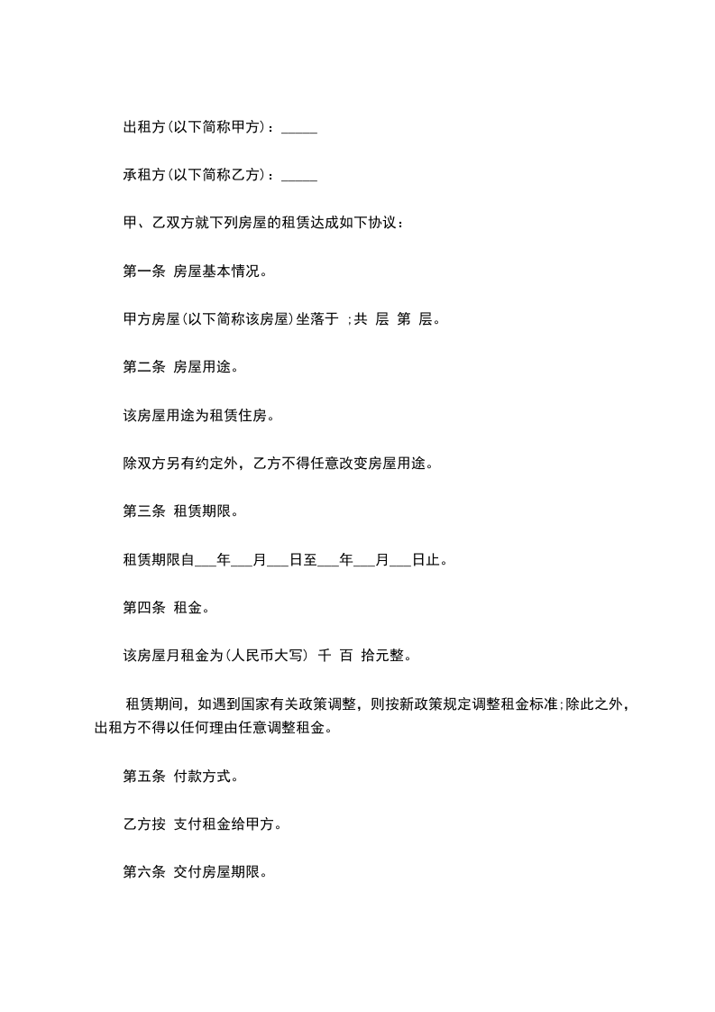 租赁期间,如遇到国家有关政策调整,则按新政策规定调整租金标准;除此之外,出租方不得以任何理由任意调整租金。