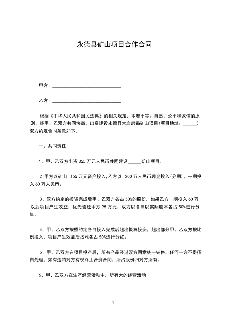1、甲、乙双方出资355万元人民币共同建设______矿山项目。