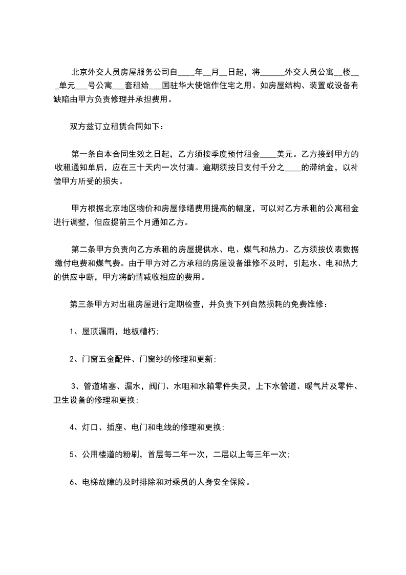 二、本房屋月租金为人民币__________元(押金_________元),按季度年结算。每季季初__日内,乙方向甲方支付全季年租金。