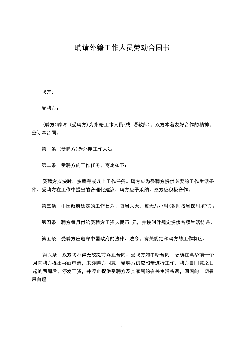 (聘方)聘请 (受聘方)为外籍工作人员(或 语教师),双方本着友好合作的精神,签订本合同。