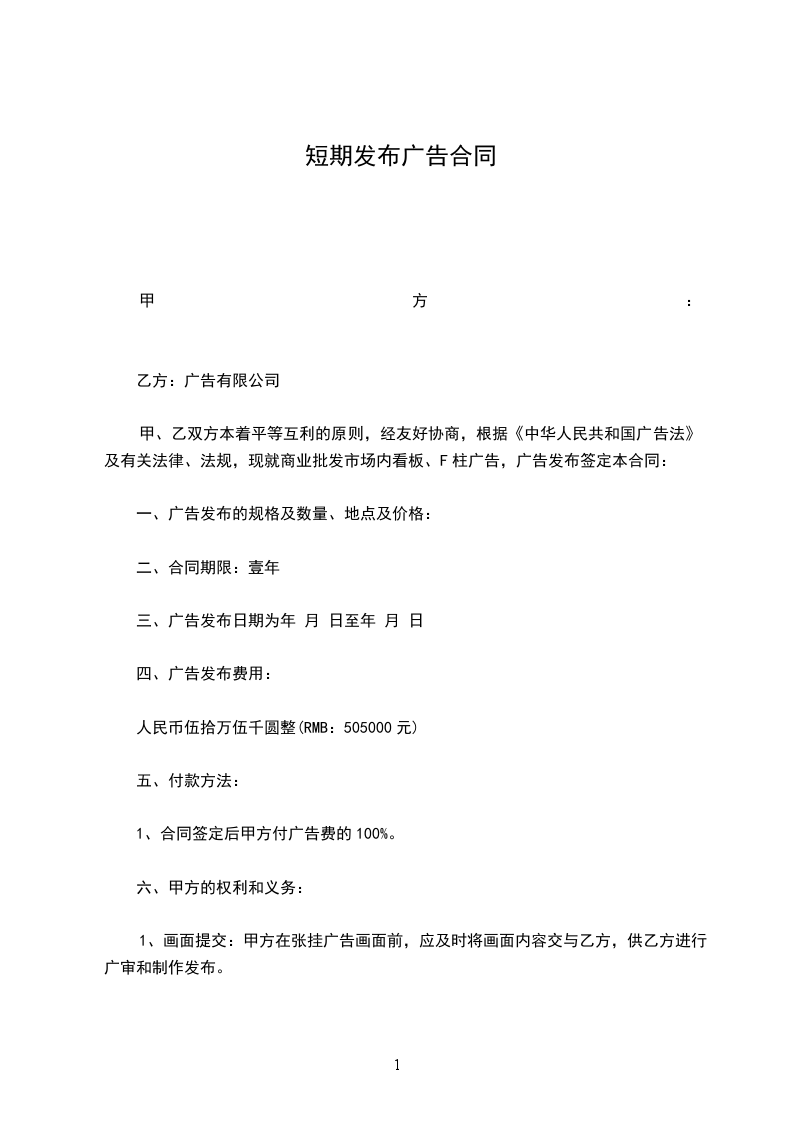 甲、乙双方本着平等互利的原则,经友好协商,根据《中华人民共和国广告法》及有关法律、法规,现就商业批发市场内看板、F柱广告,广告发布签定本合同: