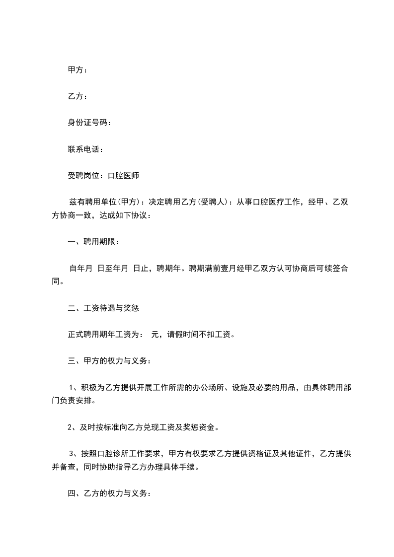 兹有聘用单位(甲方):决定聘用乙方(受聘人):从事口腔医疗工作,经甲、乙双方协商一致,达成如下协议: