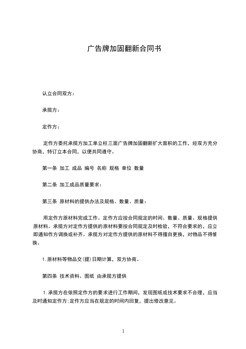 定作方委托承揽方加工单立柱三面广告牌加固翻新扩大面积的工作,经双方充分协商,特订立本合同,以便共同遵守。