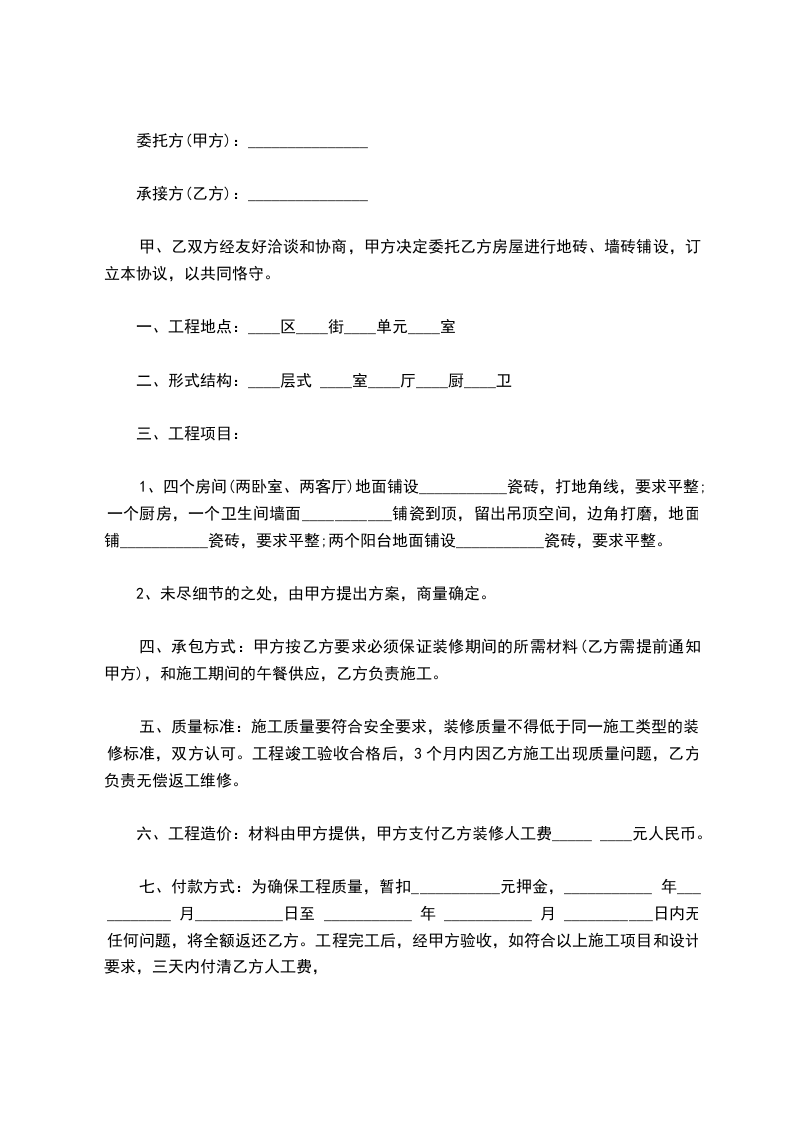 甲、乙双方经友好洽谈和协商,甲方决定委托乙方房屋进行地砖、墙砖铺设,订立本协议,以共同恪守。