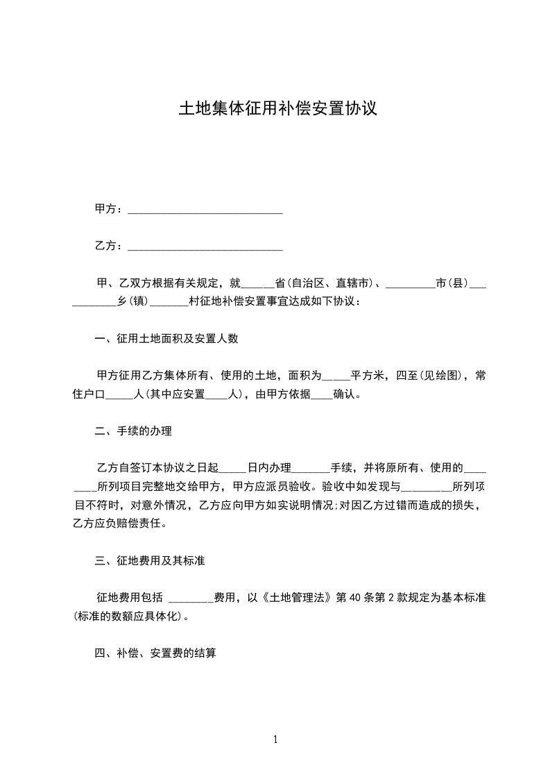 甲方征用乙方集体所有、使用的土地,面积为_____平方米,四至(见绘图),常住户口_____人(其中应安置____人),由甲方依据____确认。