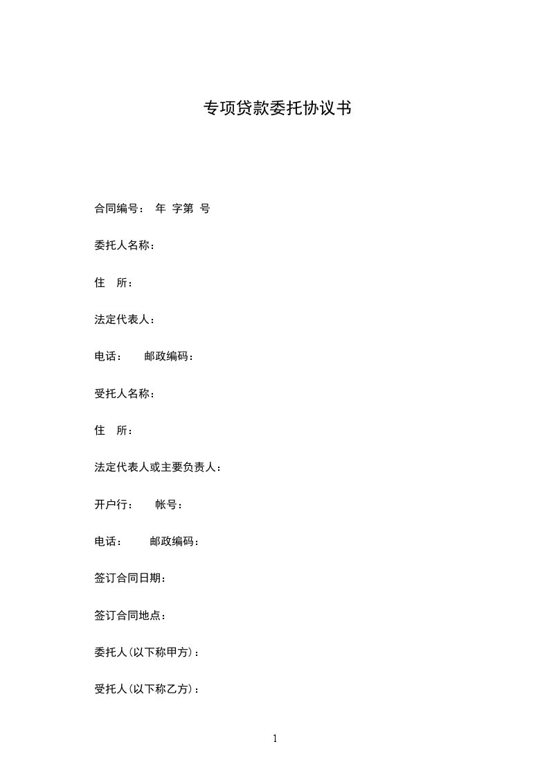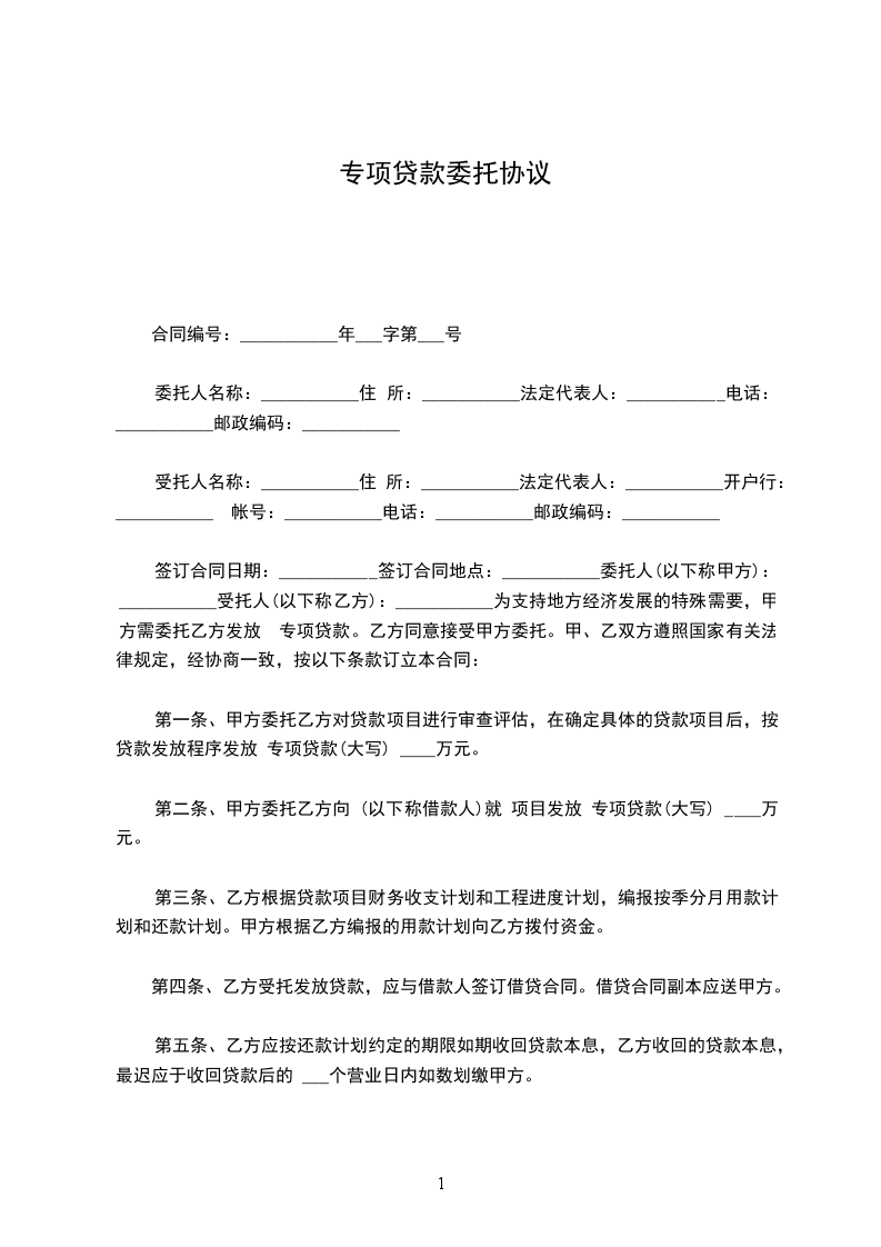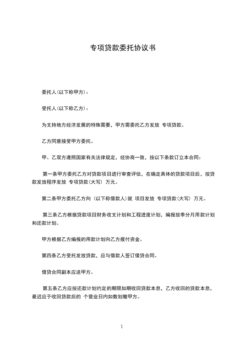 第一条 甲方委托乙方对贷款项目进行审查评估,在确定具体的贷款项目后,按贷款发放程序发放 专项贷款(大写) 万元。