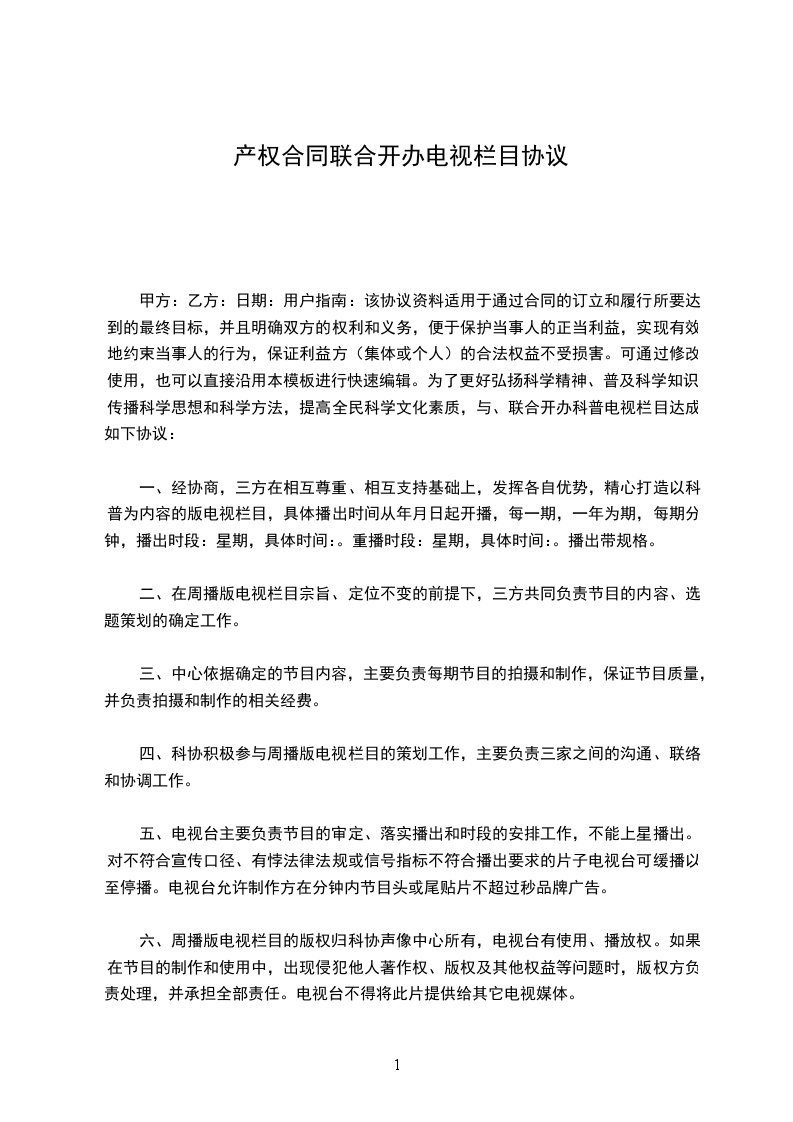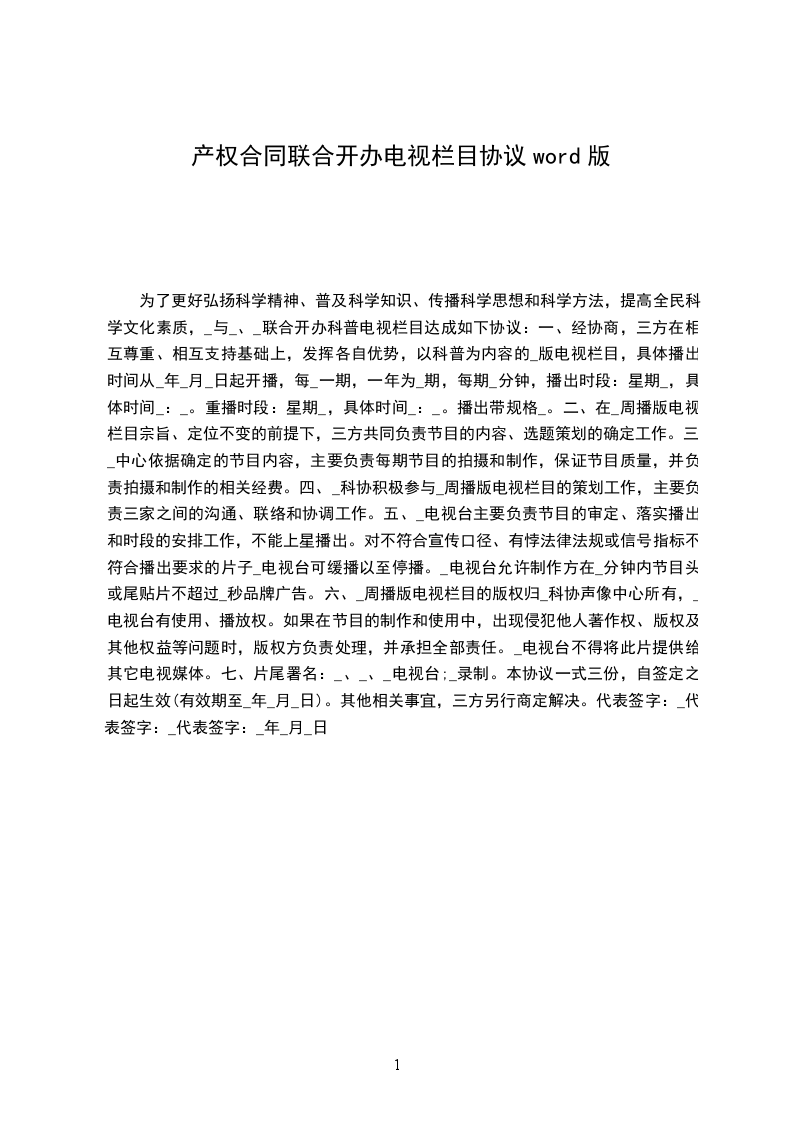 1、“经协商,三方在相互尊重、相互支持基础上,发挥各自优势,精心打造以科普为内容的《科普大篷车》周播版电视栏目,具体播出时间从____年___ 月____日起开播,每周一期,一年为52期,每期15分钟,播出时段:星期(__ ),具体时间(__ :__)。重播时段:星期(__ ),具体时间(__ :__)。播出带规格____。