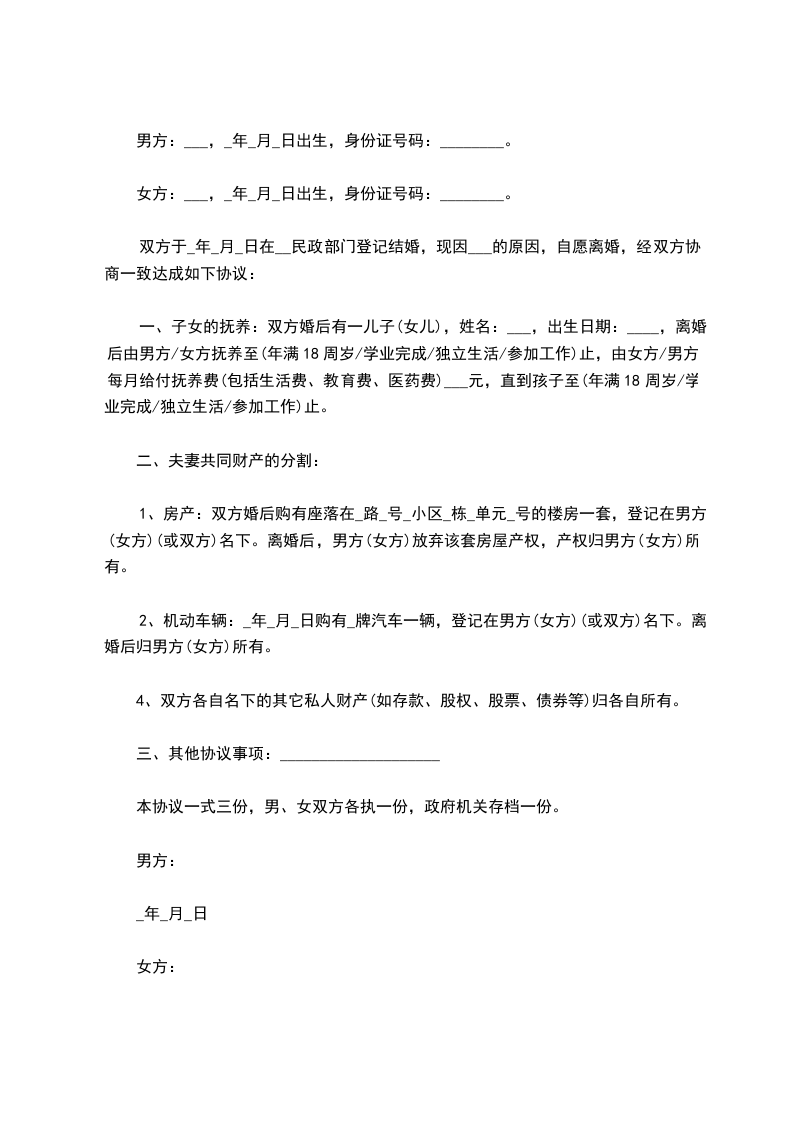 本协议一式三份,男、女双方各执一份,政府机关存档一份。