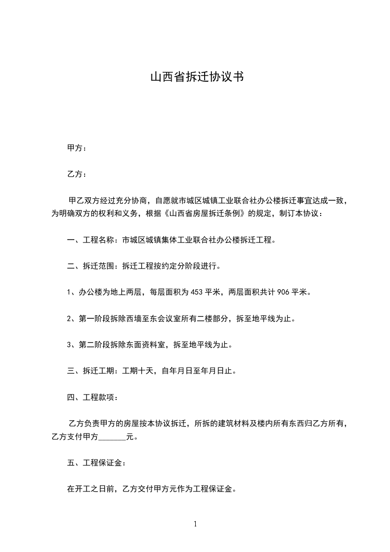 甲乙双方经过充分协商,自愿就市城区城镇工业联合社办公楼拆迁事宜达成一致,为明确双方的权利和义务,根据《山西省房屋拆迁条例》的规定,制订本协议: