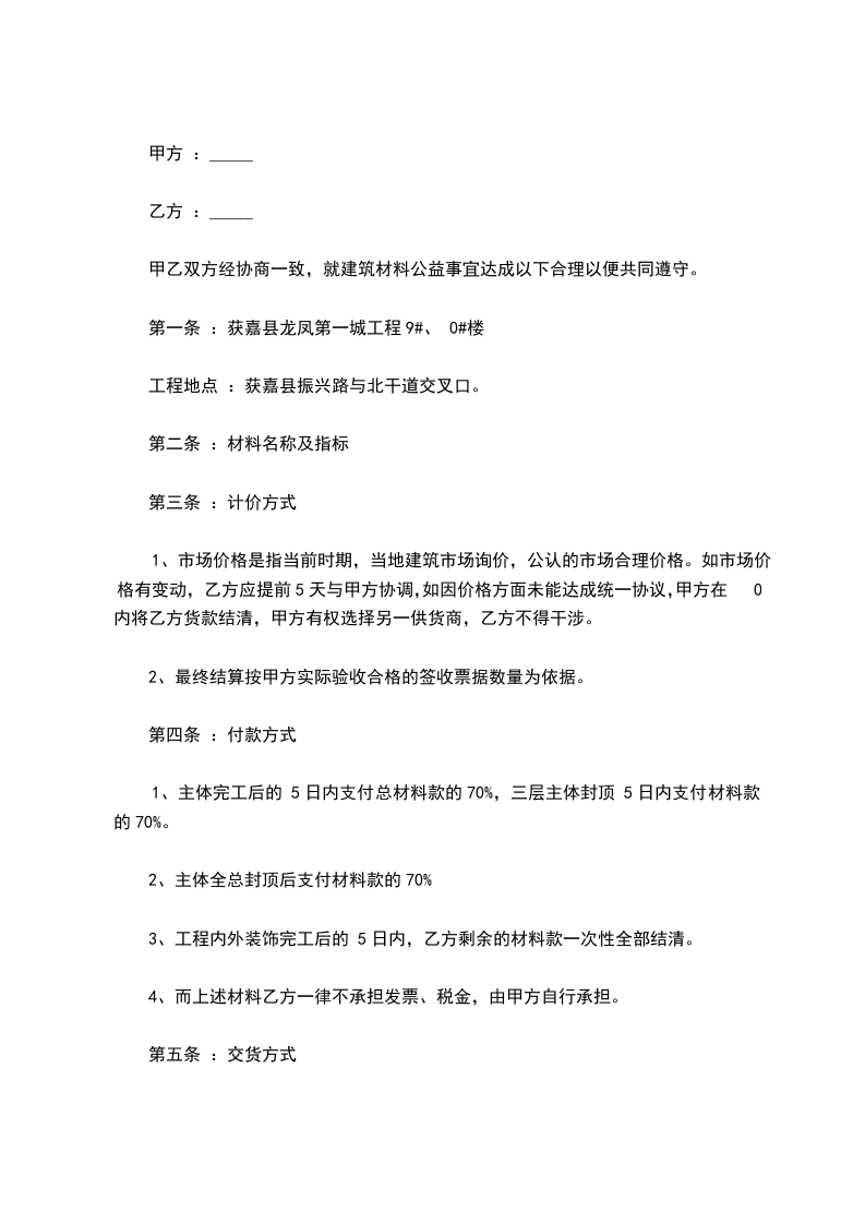 从甲方发出材料需求单日起计,乙方需在一日内将甲方需要的材料供应至甲方指定的地点,如延期所造成的一切损失都由乙方承担(不可抗因素外),乙方不得在任何情况下停止供货。