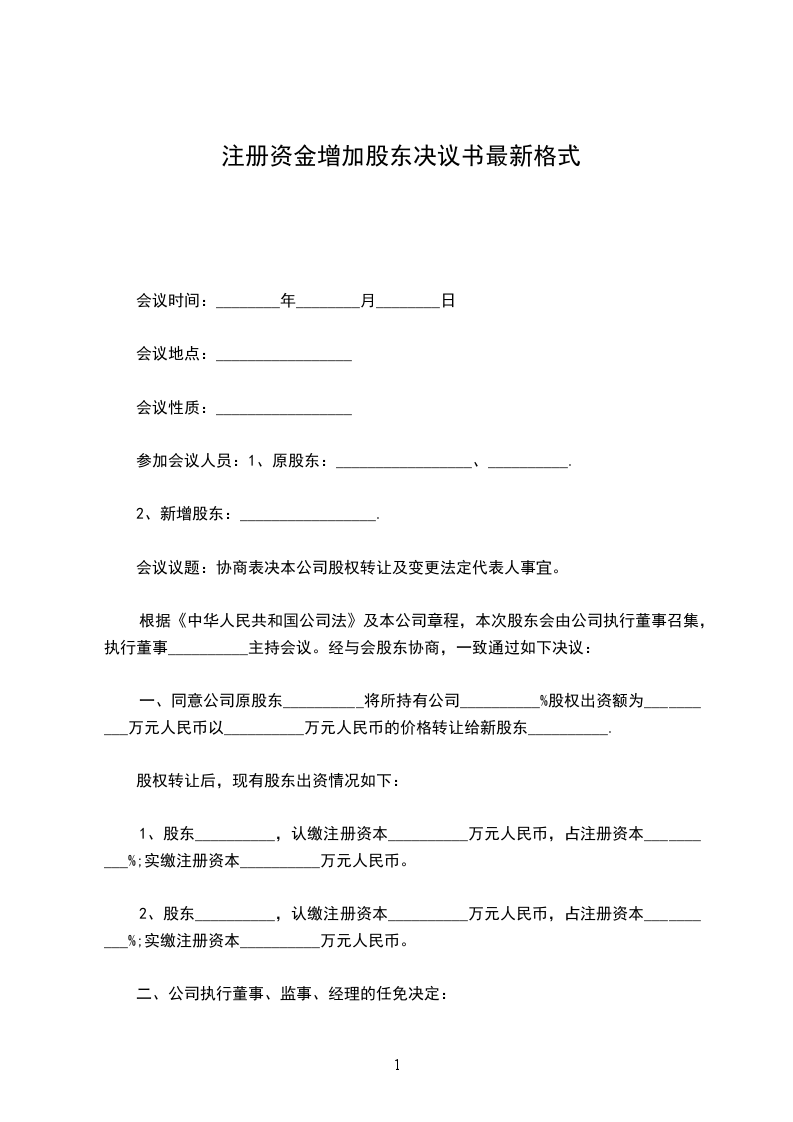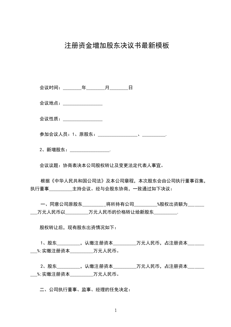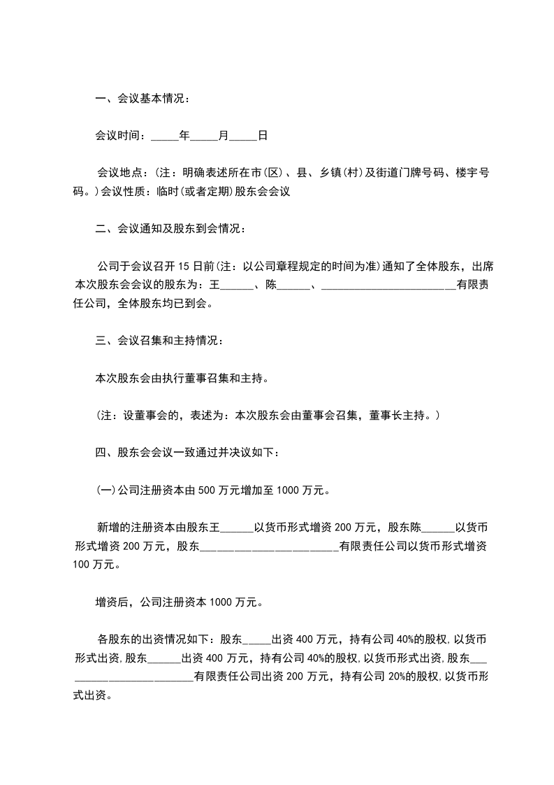 一、同意公司注册资本由目前的_________元人民币增加至_________元人民币,新增的_________元注册资本由_________(股东)以_________出资_________万元人民币,_________(股东)以_________出资_________万元人民币,变更后的股权结构为_________(股东)占_________%,_________(股东)占_________%。