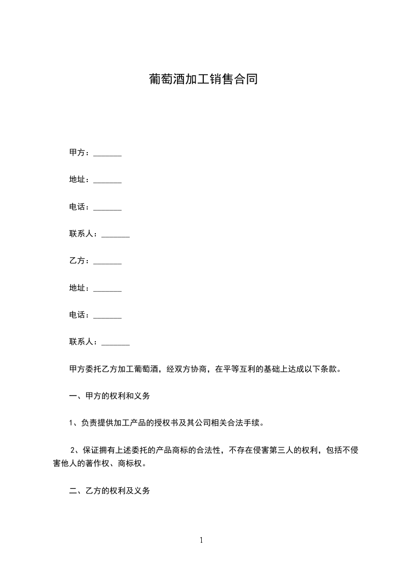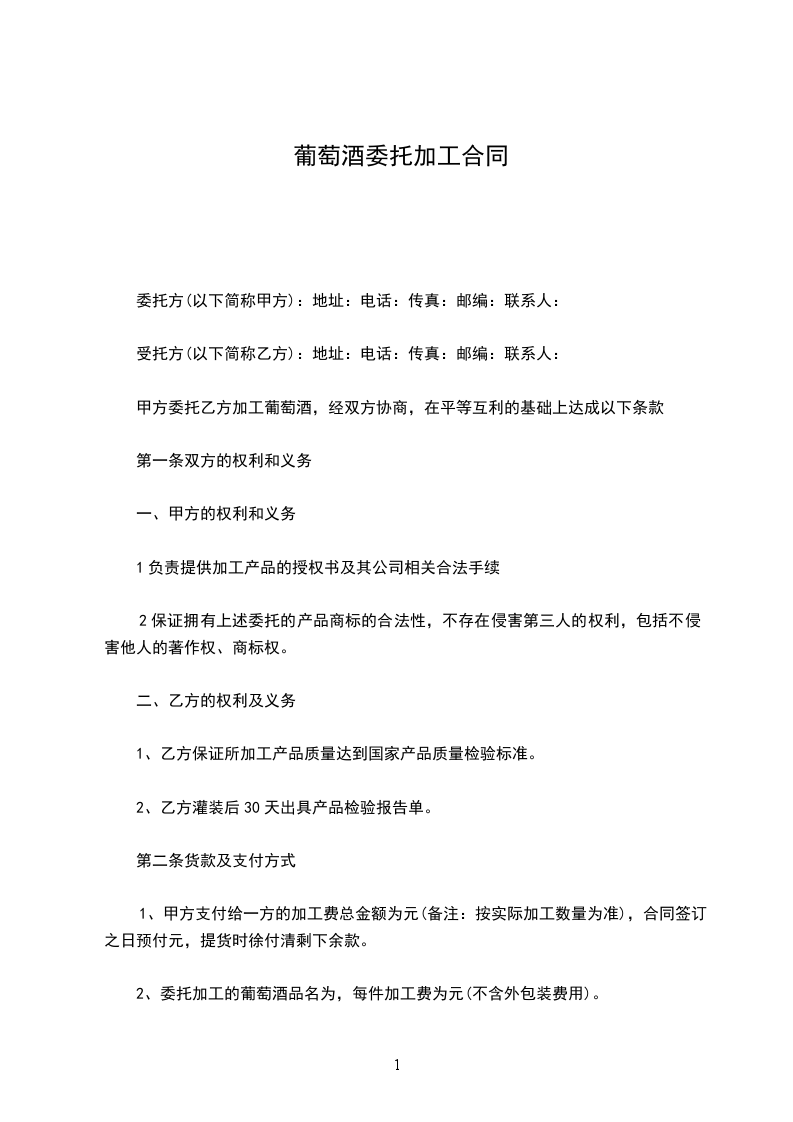 甲方委托乙方加工葡萄酒,经双方协商,在平等互利的基础上达成以下条款