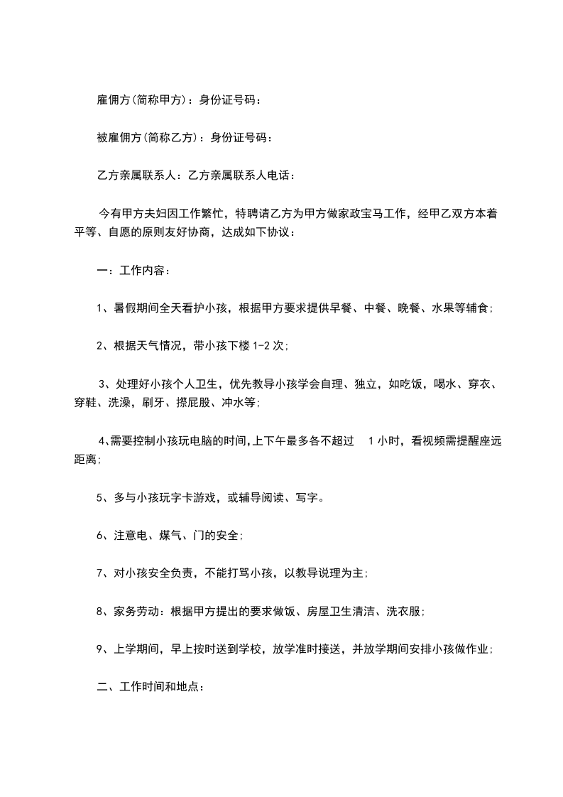1、暑假期间全天看护小孩,根据甲方要求提供早餐、中餐、晚餐、水果等辅食;