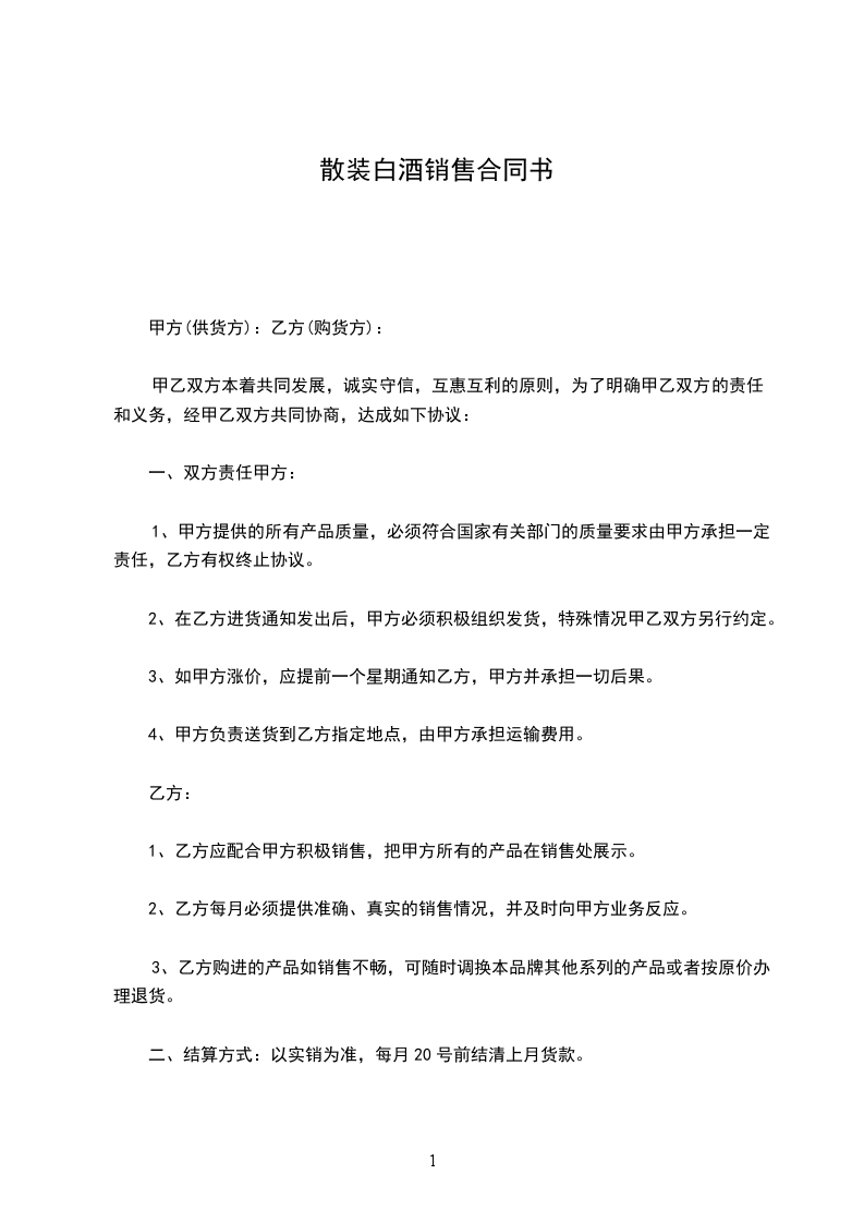 二、结算方式:以实销为准,每月20号前结清上月货款。