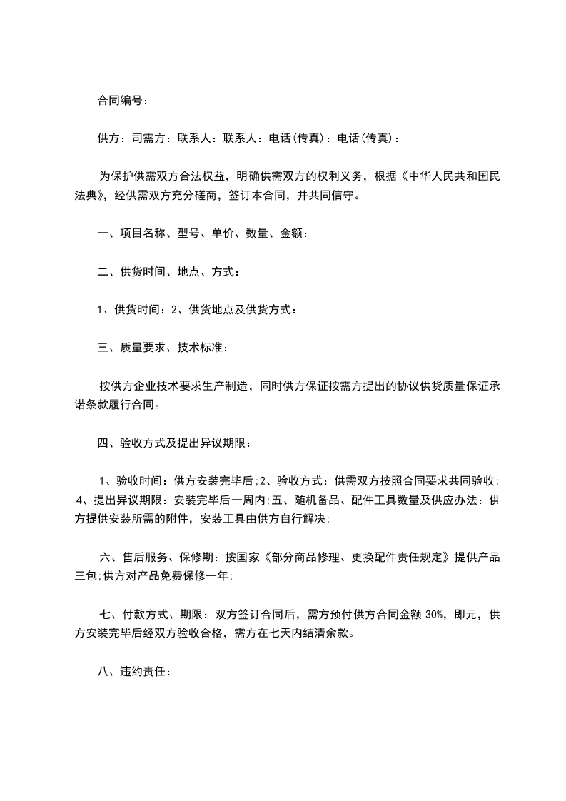 七、付款方式、期限:双方签订合同后,需方预付供方合同金额30%,即元,供方安装完毕后经双方验收合格,需方在七天内结清余款。