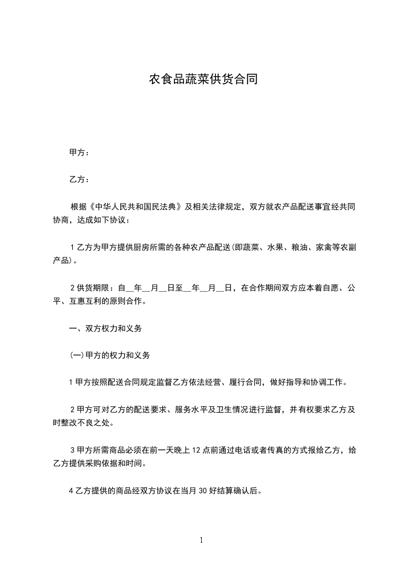 1乙方为甲方提供厨房所需的各种农产品配送(即蔬菜、水果、粮油、家禽等农副产品)。