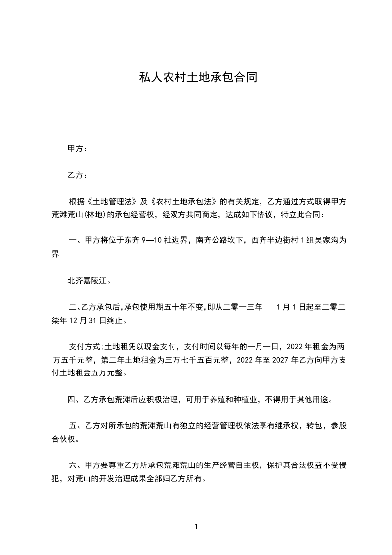 五、乙方对所承包的荒滩荒山有独立的经营管理权依法享有继承权,转包,参股合伙权。