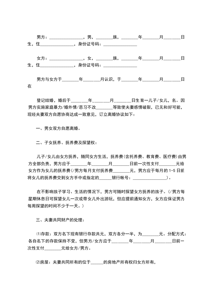 登记结婚,婚后于________年________月________日生育一儿子/女儿,名。因男方实施家庭暴力/婚外情/恶习不改________等致使夫妻感情破裂,已无和好可能,现经夫妻双方自愿协商达成一致意见,订立离婚协议如下: