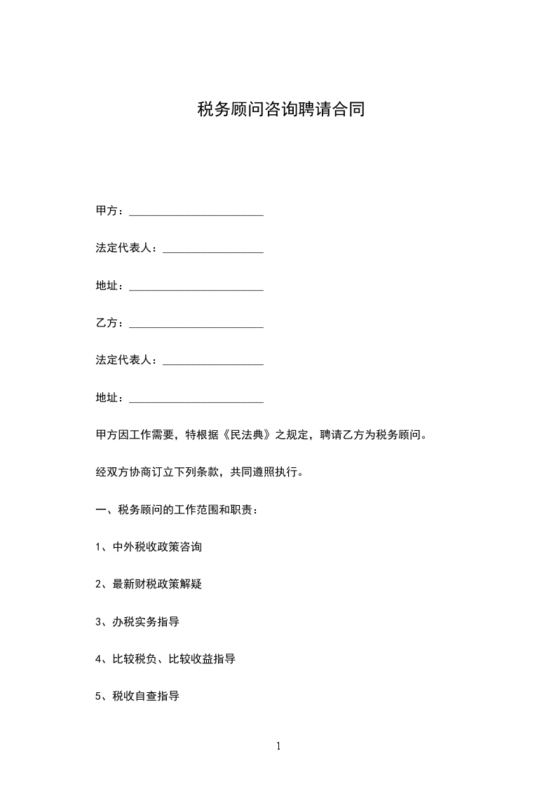 甲方因工作需要,特根据《民法典》之规定,聘请乙方为税务顾问。