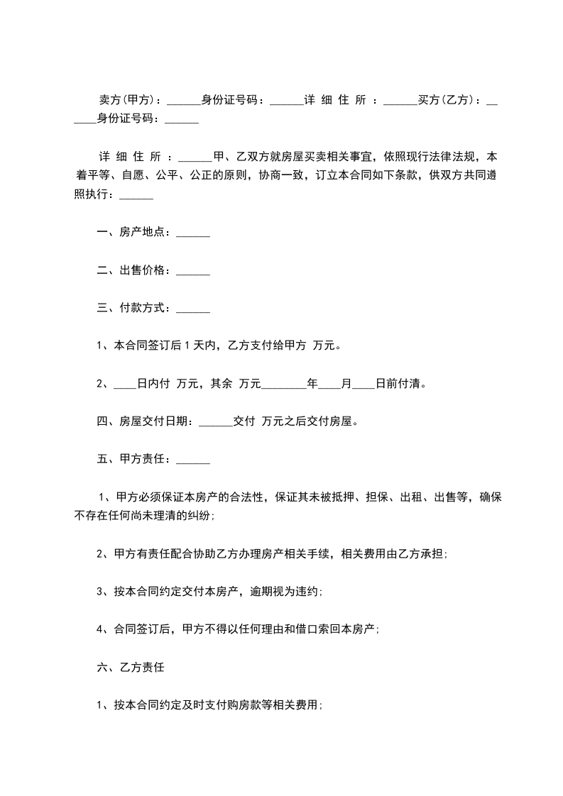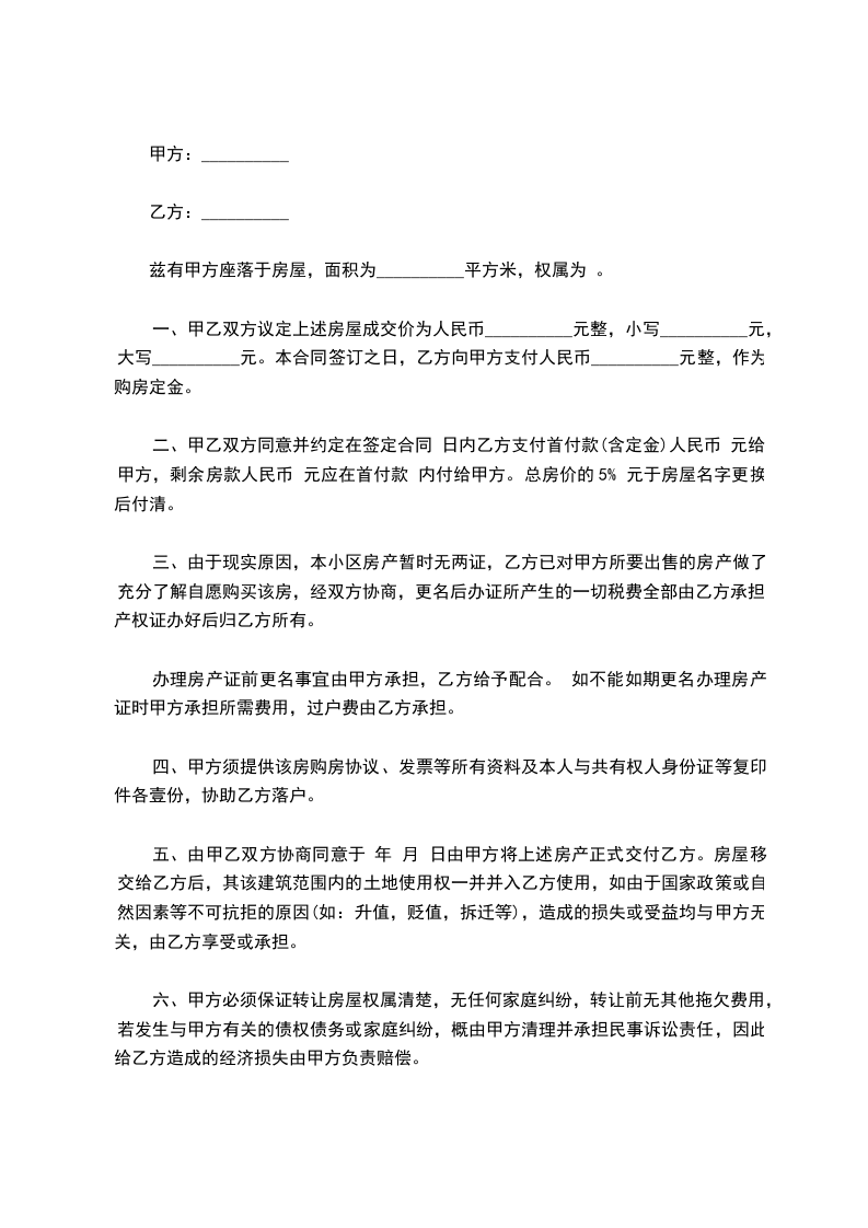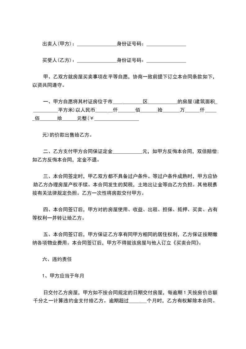 一、甲方自愿将其村证房位于市____________区____________的房屋(建筑面积___________平方米)以人民币_______仟_______佰_______拾_______万______仟______佰_______拾______元整(¥__________________