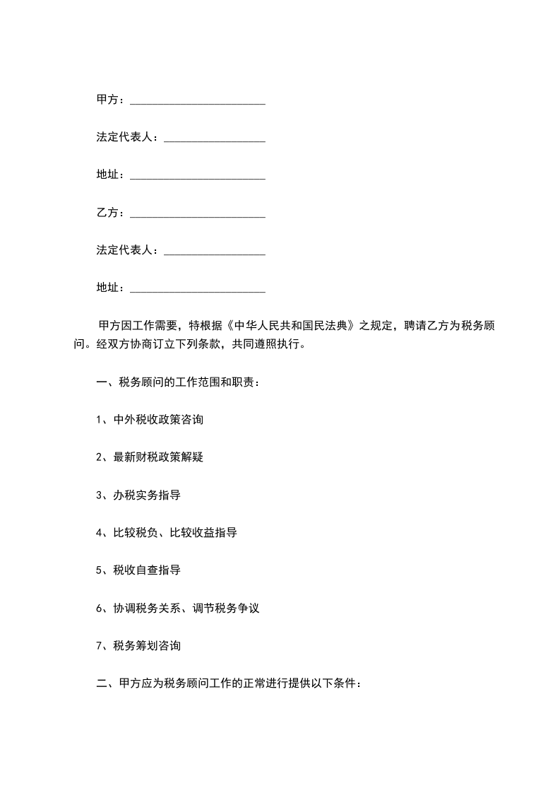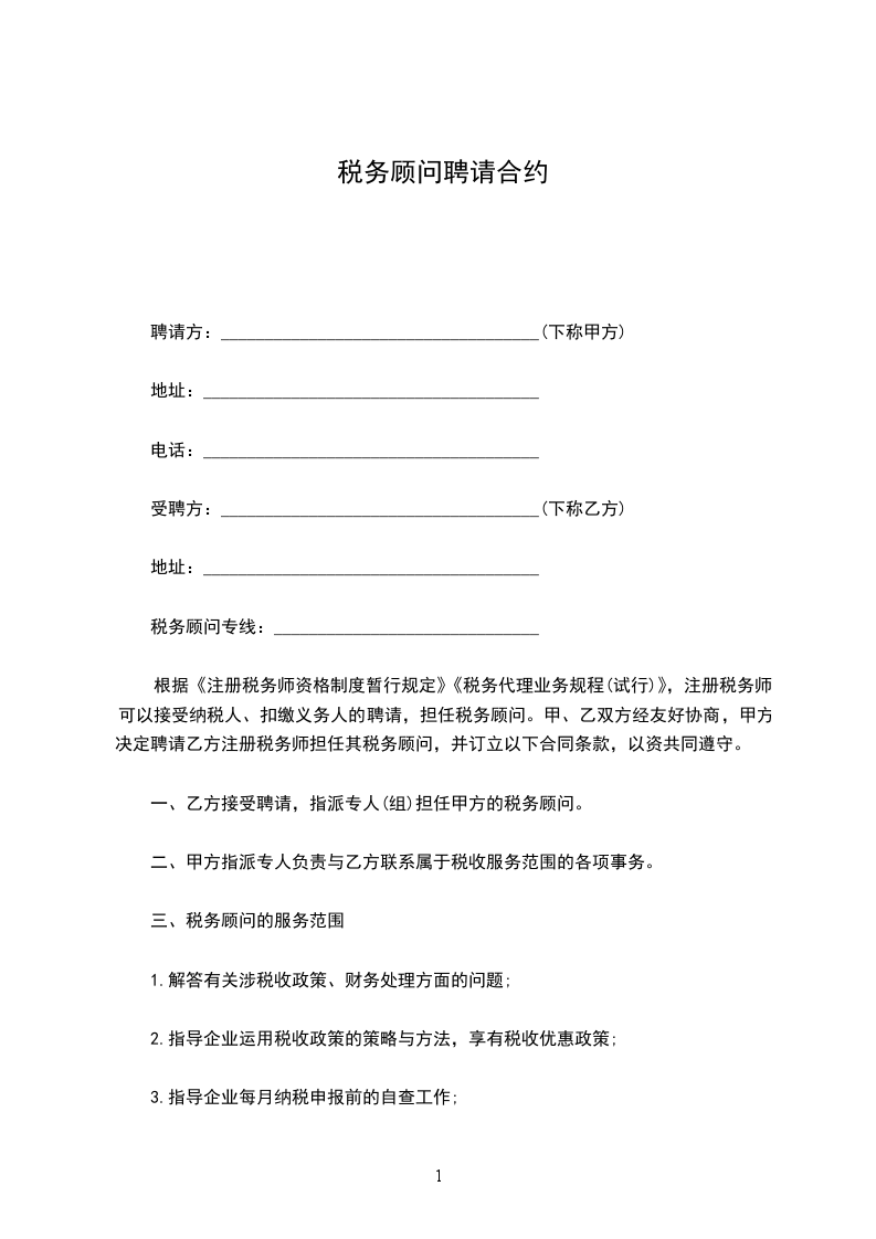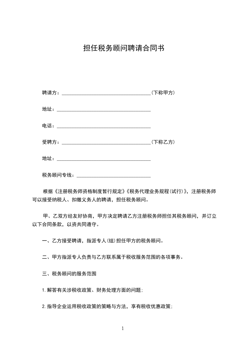 一、乙方接受聘请,指派专人(组)担任甲方的税务顾问。