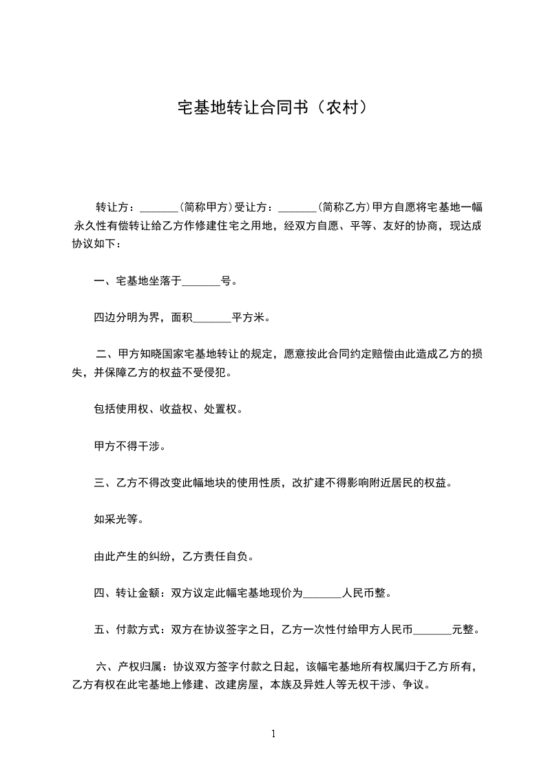 转让方:_______(简称甲方)受让方:_______(简称乙方)甲方自愿将宅基地一幅永久性有偿转让给乙方作修建住宅之用地,经双方自愿、平等、友好的协商,现达成协议如下: