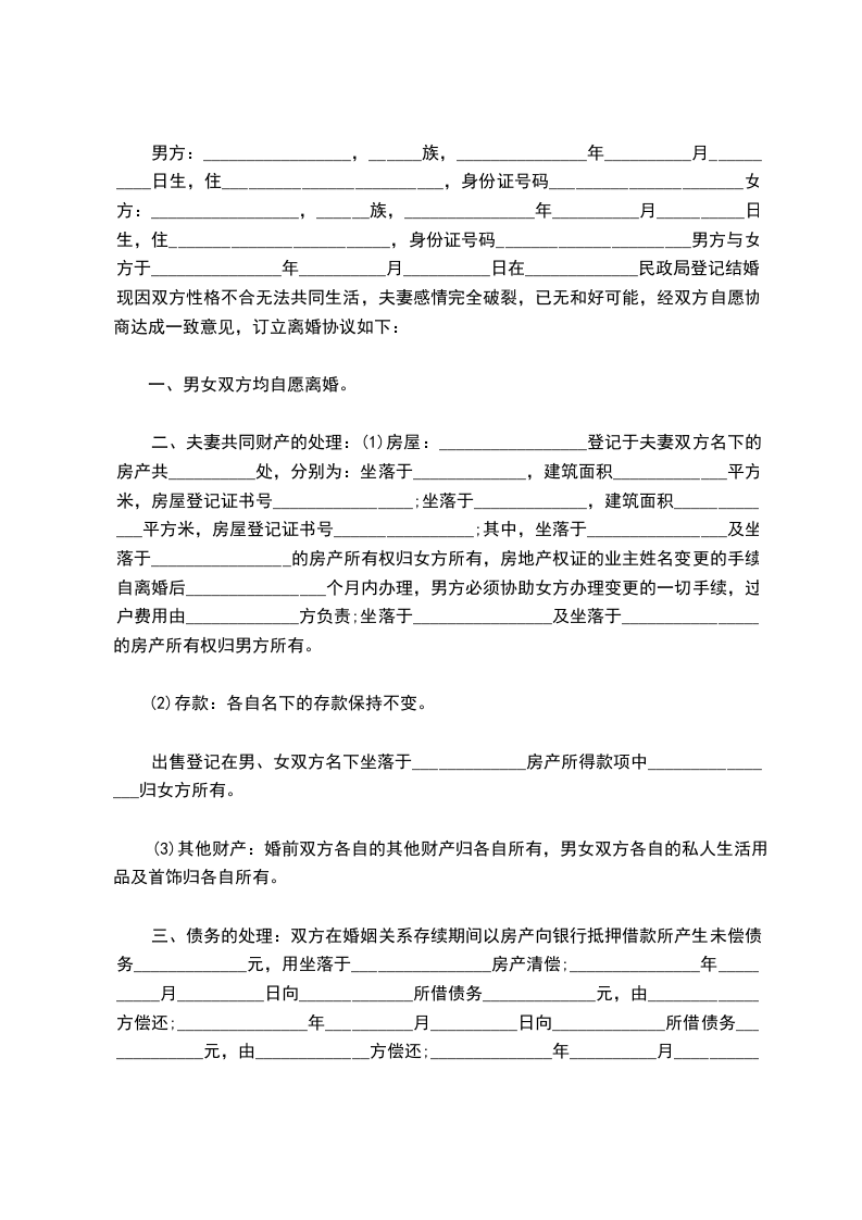 男方:_________________,______族,_______________年__________月__________日生,住_________________________,身份证号码______________________女方:_________________,______族,_______________年__________月__________日生,住_________________________,身份证号码______________________男方与女方于_______________年__________月__________日在_____________民政局登记结婚,现因双方性格不合无法共同生活,夫妻感情完全破裂,已无和好可能,经双方自愿协商达成一致意见,订立离婚协议如下:
