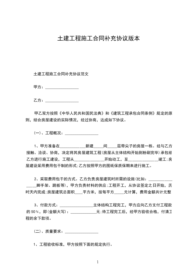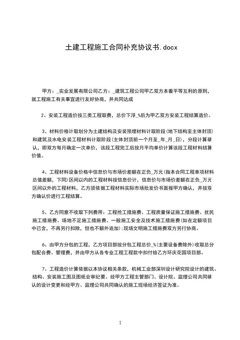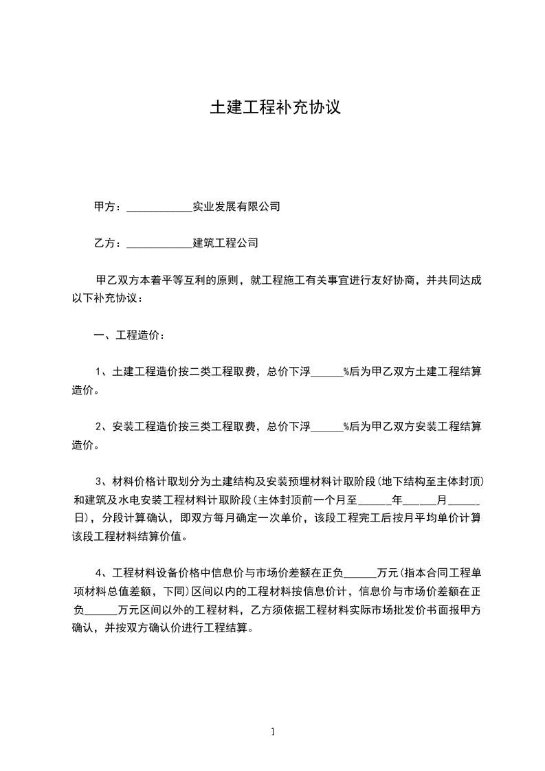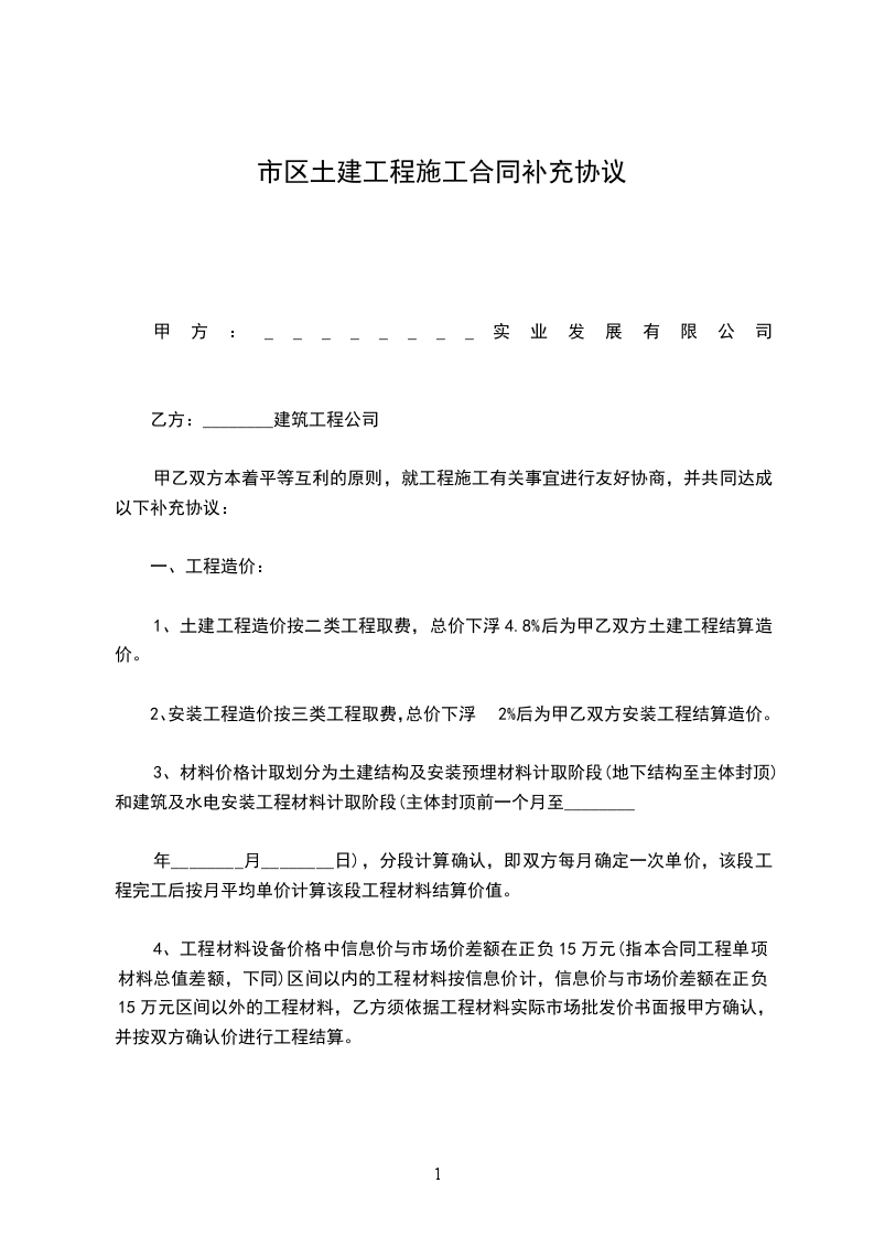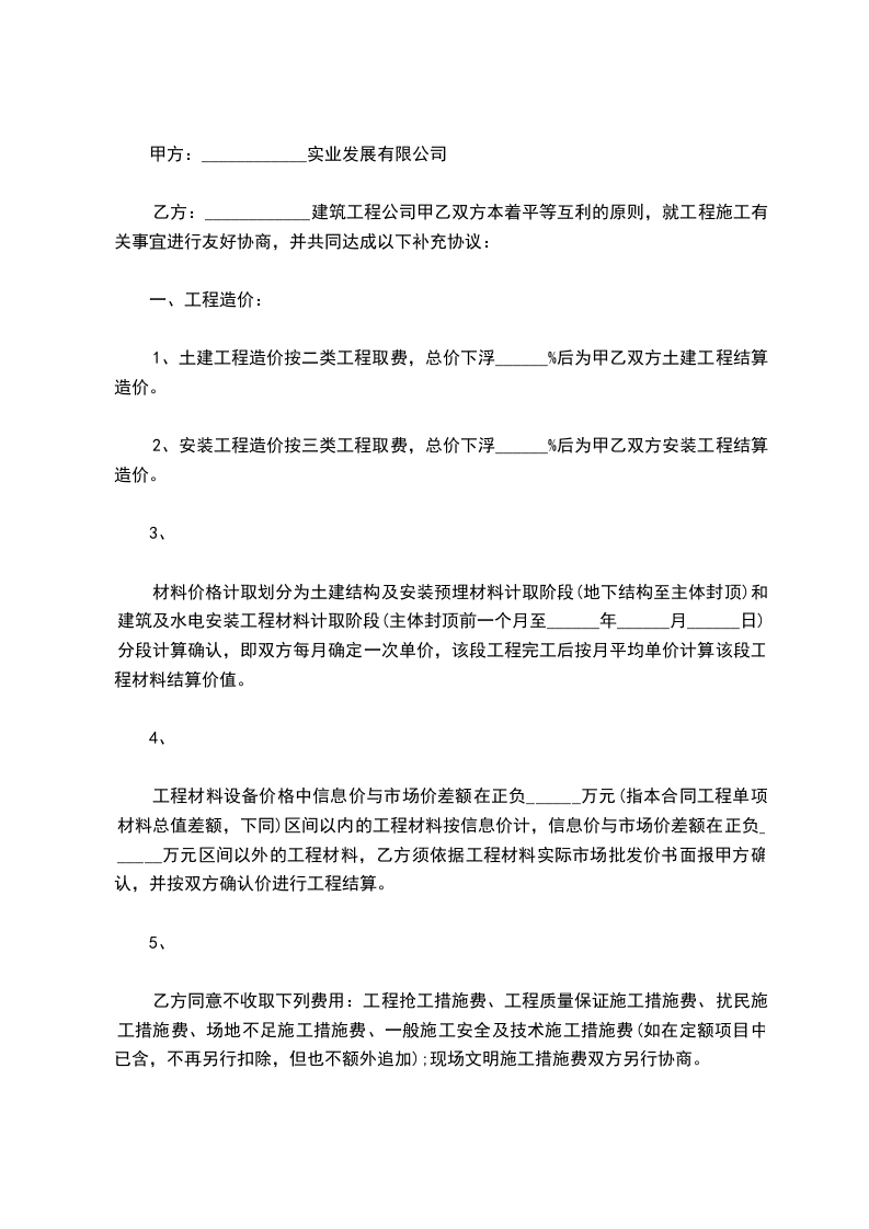 甲方:________实业发展有限公司乙方:________建筑工程公司甲乙双方本着平等互利的原则,就工程施工有关事宜进行友好协商,并共同达成以下补充协议: