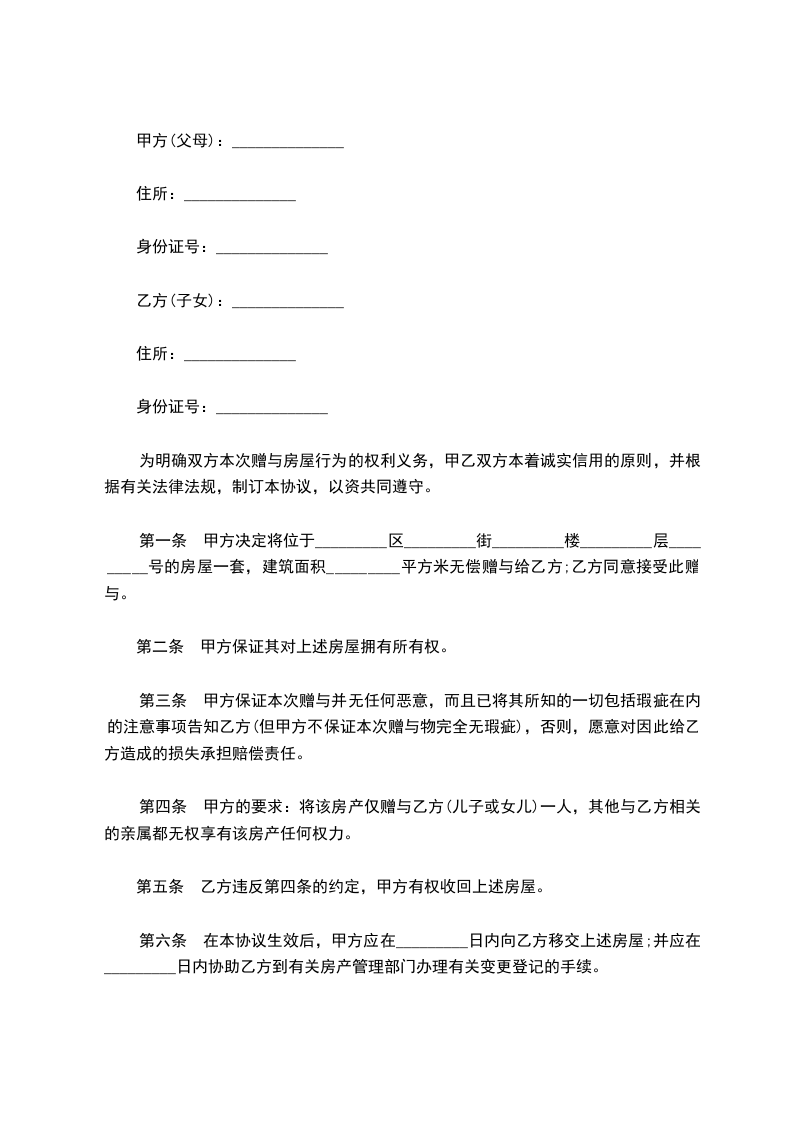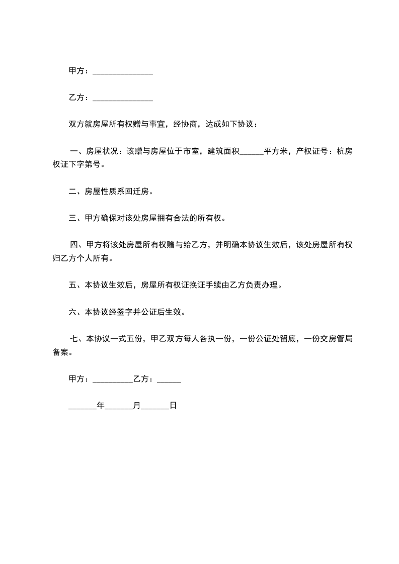双方就房屋所有权赠与事宜,经协商,达成如下协议: