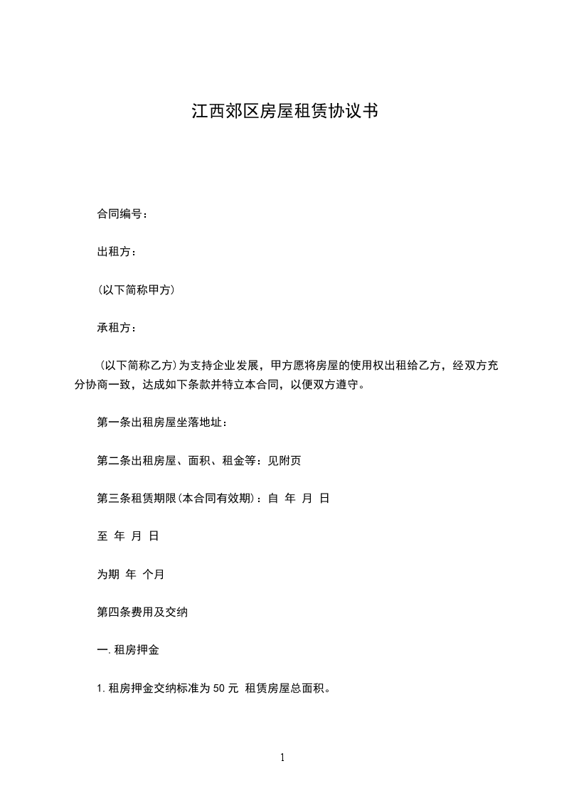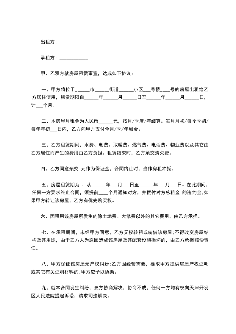 3、乙方同意支付甲方租房押金_________元整,此款将于租赁期满后由甲方返回乙方。