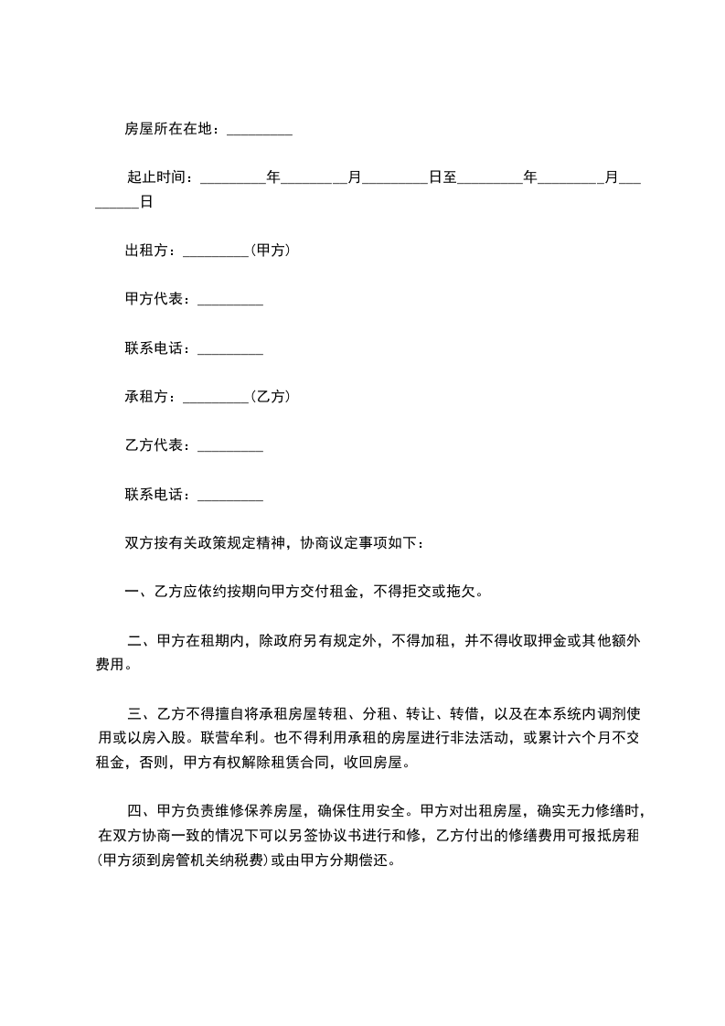 五、租赁期间,乙方不得擅自改变房屋结构、用途。因业务或其他原因需要拆改、添建或改装门面、室内装饰等,应事先征得甲方同意,议定今后处理办法,并另签协议(一式三份,其中一份报房管部门备案)。