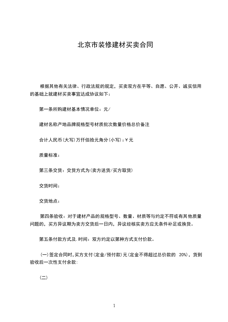 (一)签定合同时,买方支付(定金/预付款)元(定金不得超过总价款的20%),货到验收后一次性支付余款:
