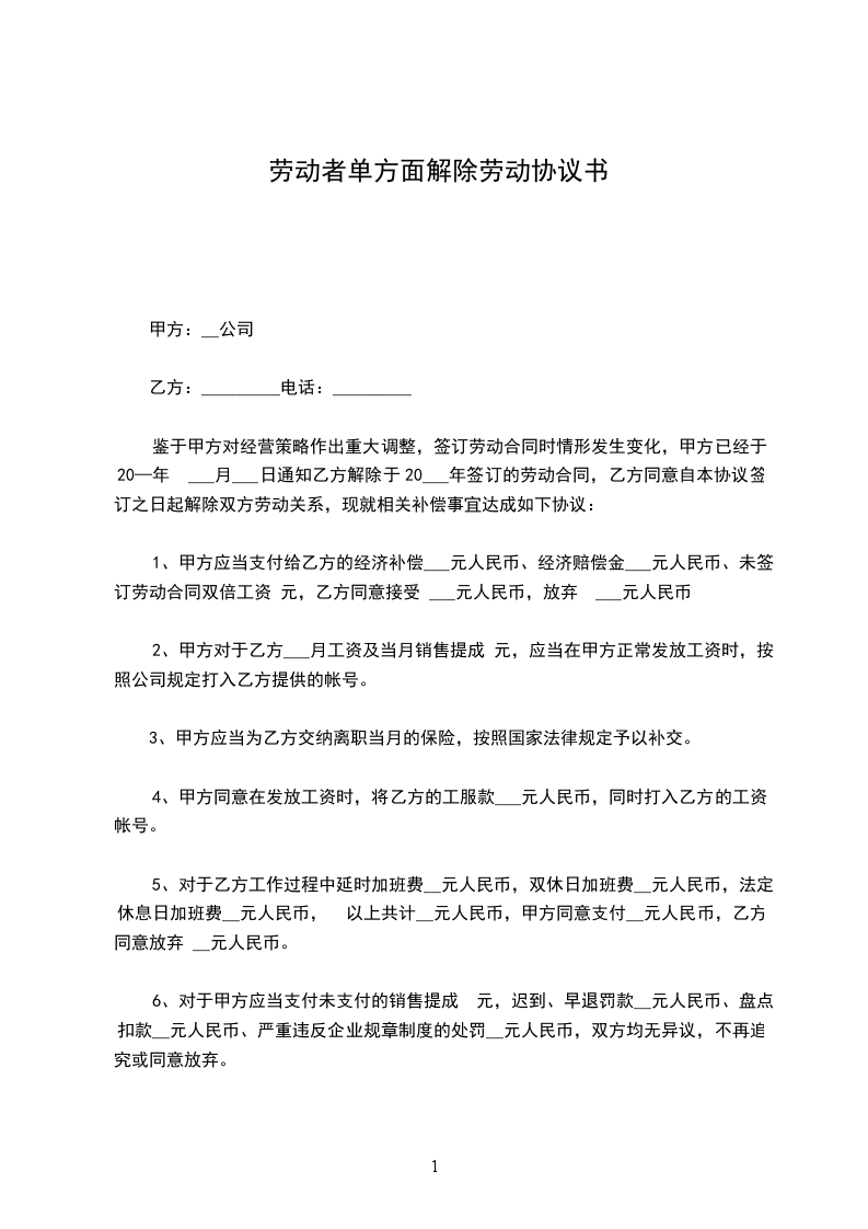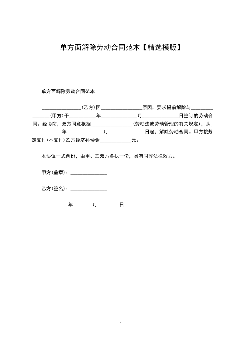 甲、乙双方于______年____月____日签订了年月(或无固定)期限劳动合同,现由 方提出协商解除劳动合同要求,经甲、乙双方协商一致,同意解除劳动合同,并达成如下协议: