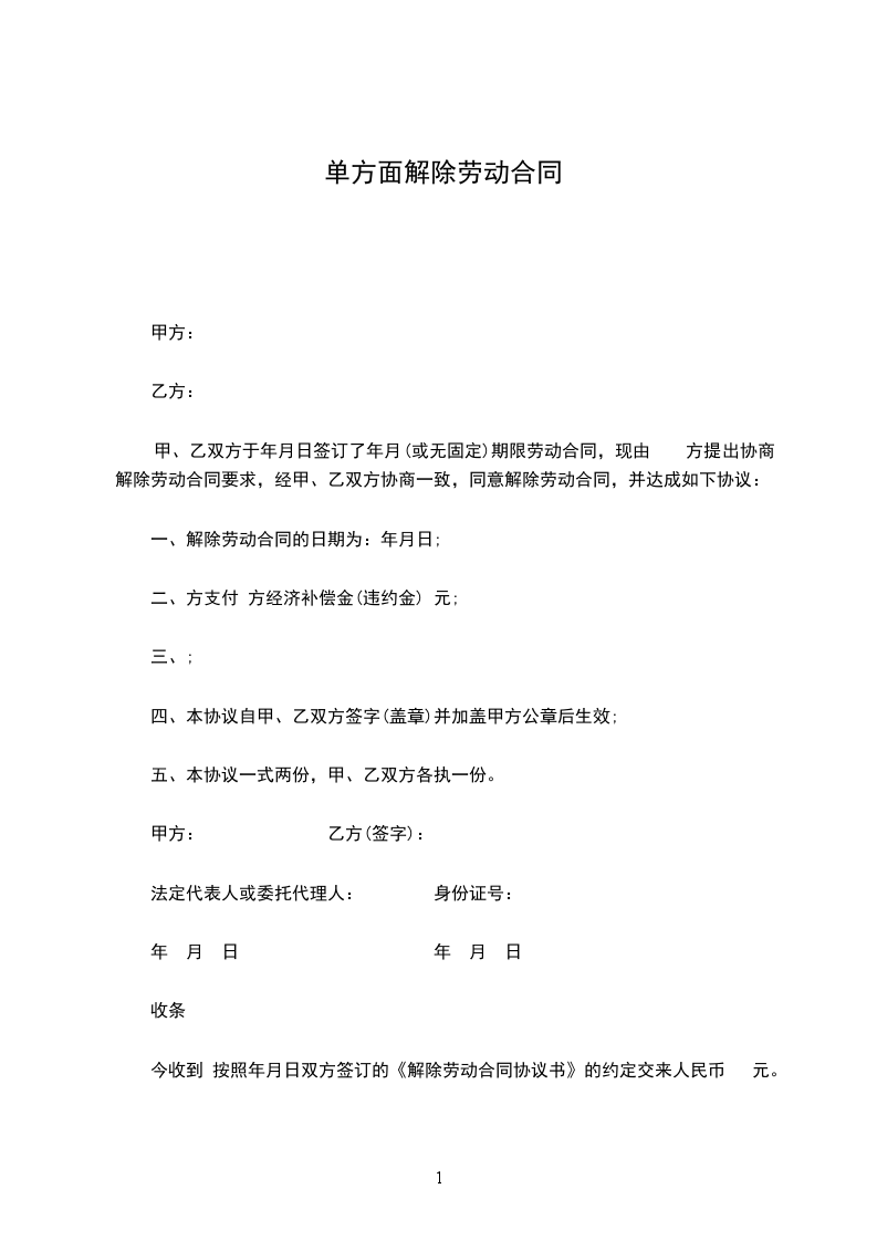 今收到 按照______年____月____日双方签订的《解除劳动合同协议书》的约定交来人民币 元。