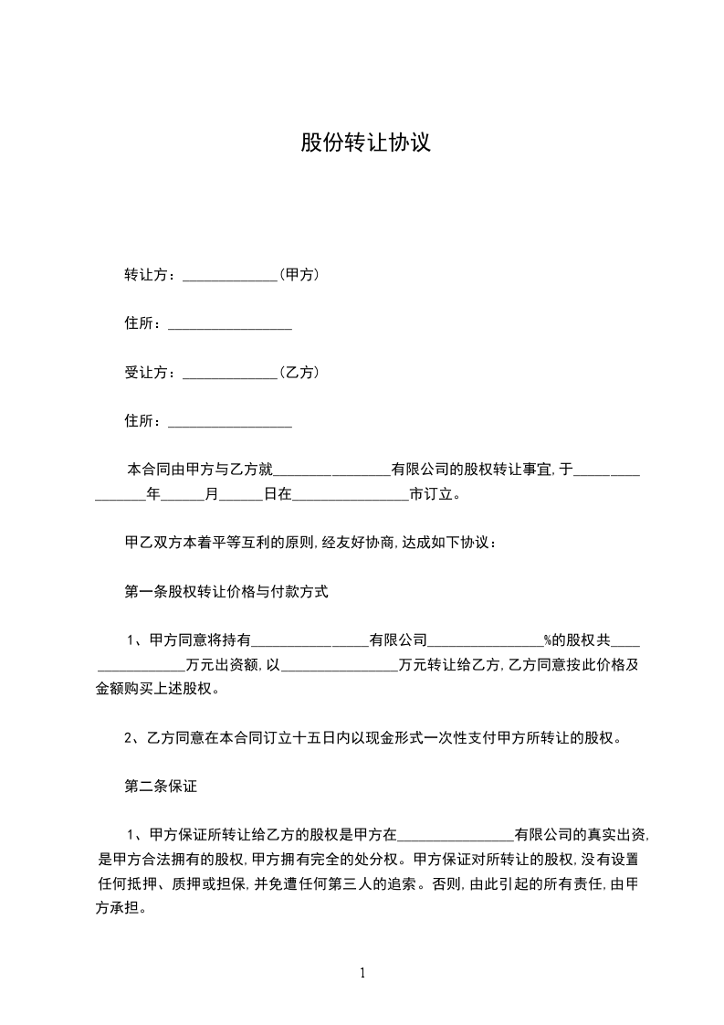 二、付款期限 在本合同签署之日起_______年______月______日之前,乙方向甲方一次性支付股份转让款。