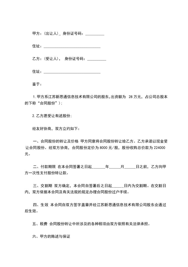 1.甲方系江苏新思通信息技术有限公司的股东,出资额为28万元,占公司总股本的下称“合同股份”);
