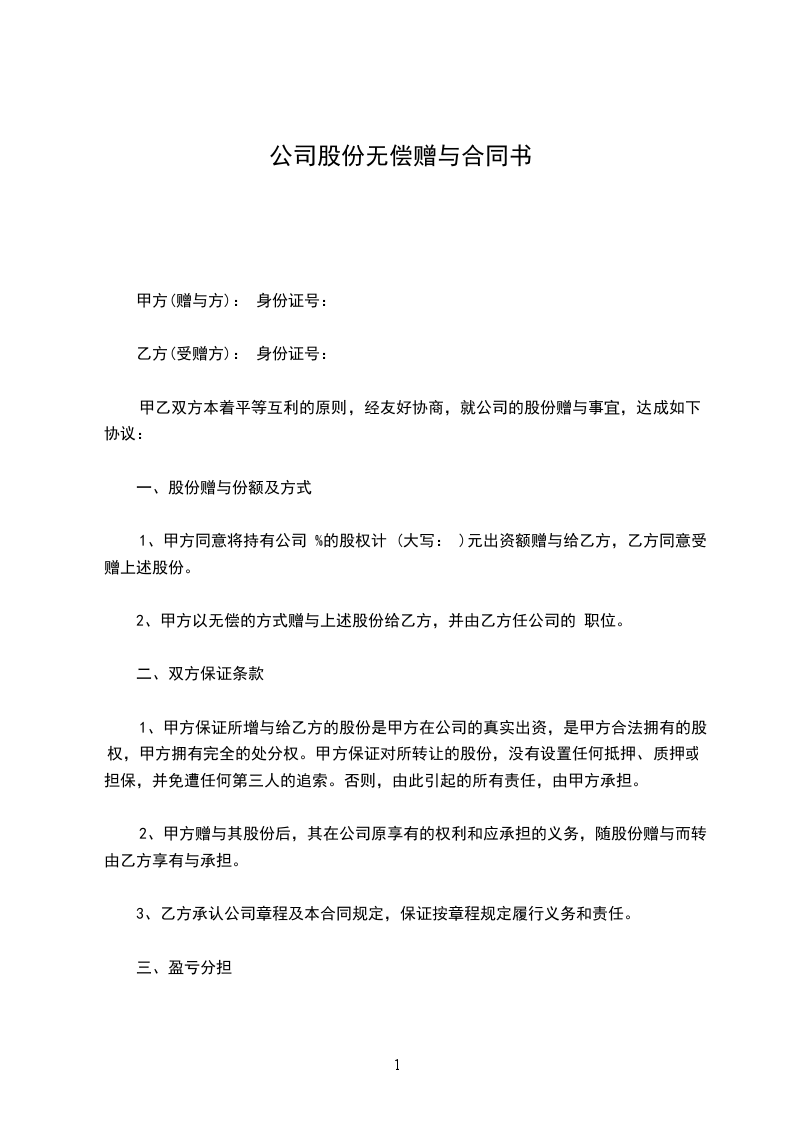 1、甲方同意将持有公司 %的股权计 (大写: )元出资额赠与给乙方,乙方同意受赠上述股份。