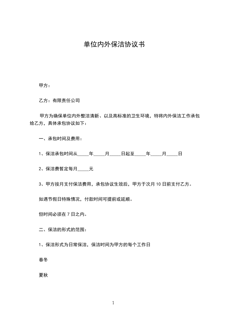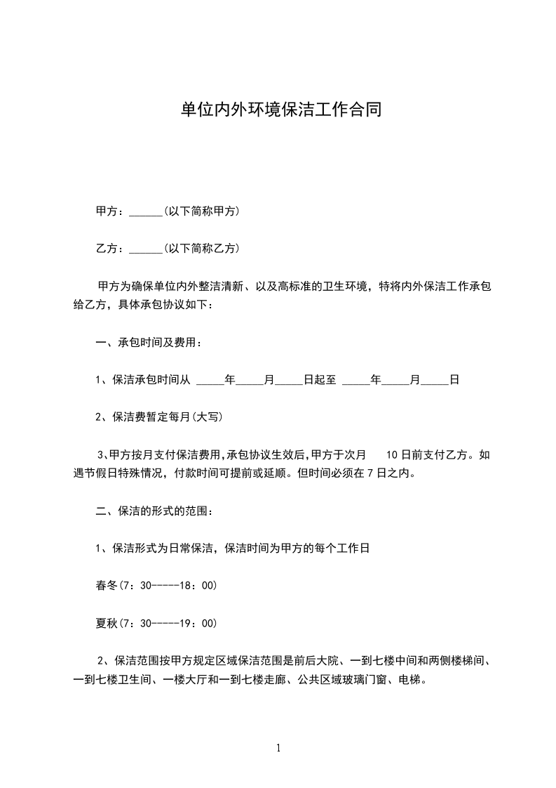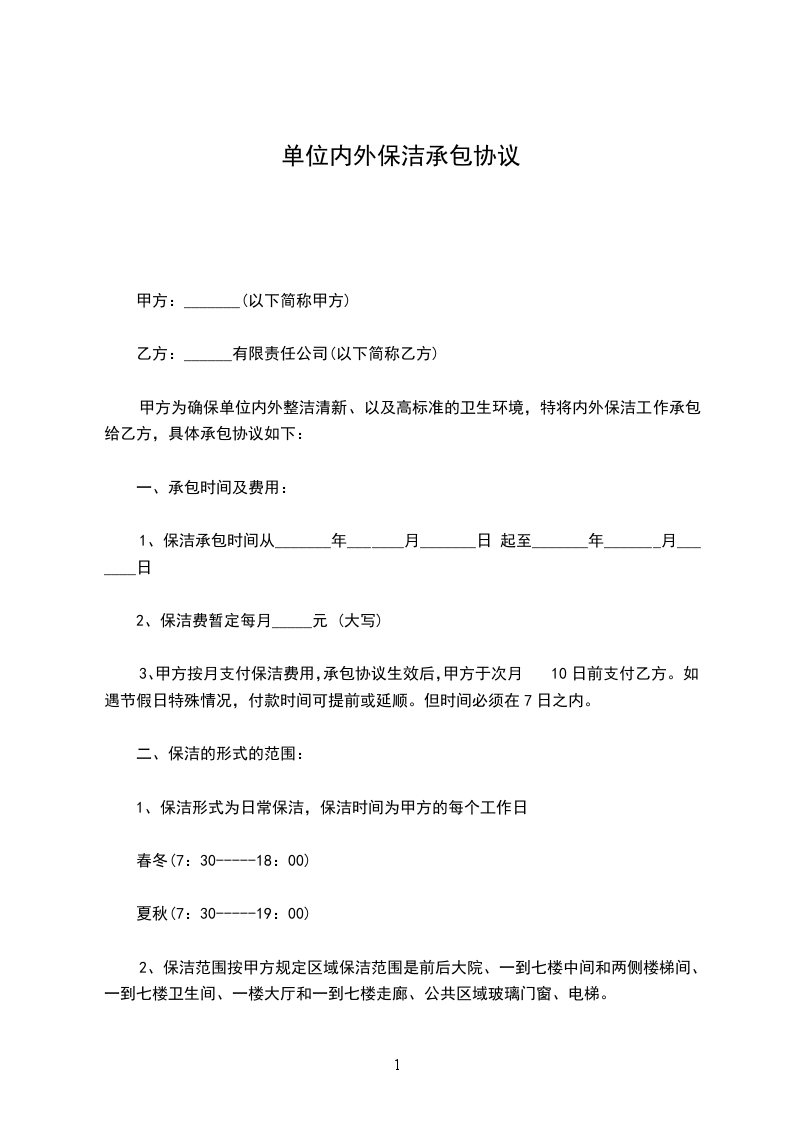 甲方为确保单位内外整洁清新、以及高标准的卫生环境,特将内外保洁工作承包给乙方,具体承包协议如下: