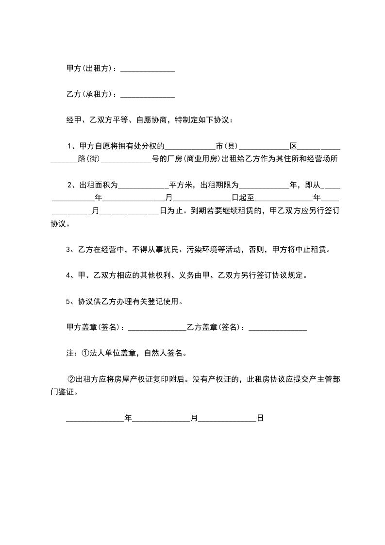 甲、乙双方依据中华人民共和国有关法律法规,在自愿、平等和互利的基础上,就___________房租赁事宜达成如下协议。