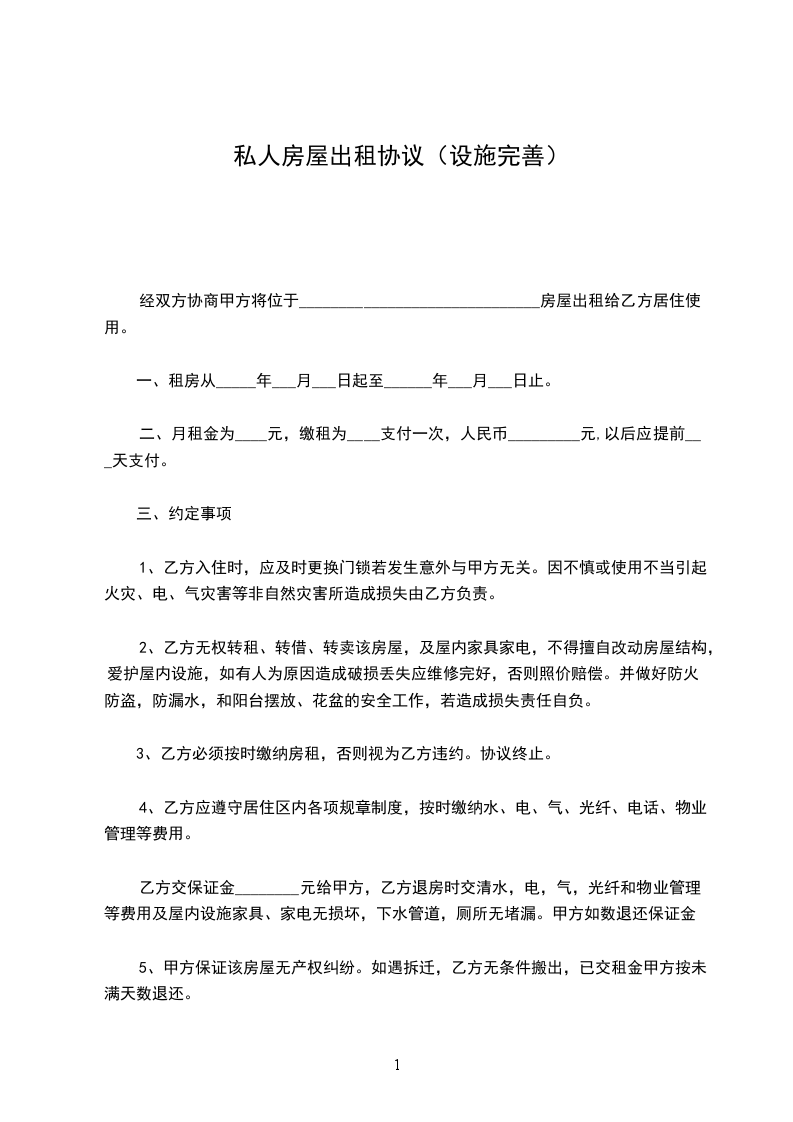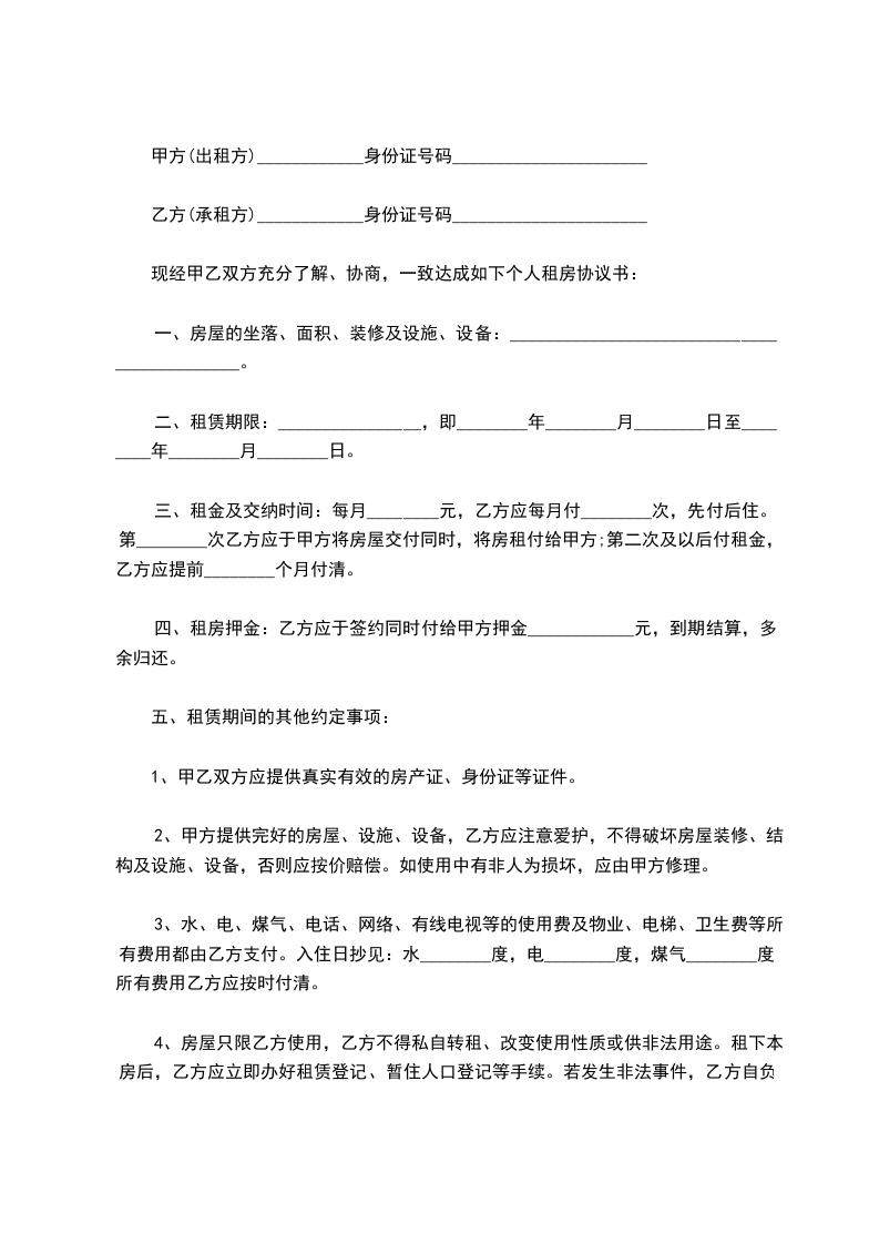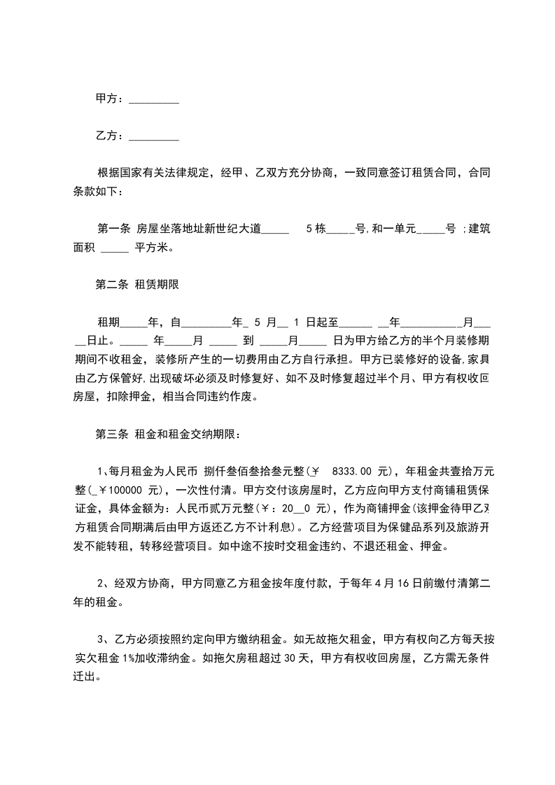 第五条 乙方签定合同时向甲方支付保证金人民币 元(大写 )。合同期满若乙方无违约行为,房屋及附属设施无损坏的,甲方将在合同到期之日将保证金无息退给乙方。